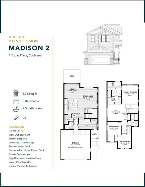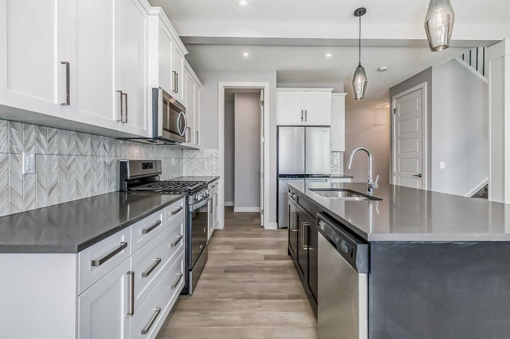 BRAND NEW HOME by Douglas Homes, Master Builder in central Greystone, short walking distance to parks, the Bow River, major shopping & interconnected pathway system. Featuring the Madison 2 on a corner lot, south facing back yard, walkout basement, deck off the main floor accented by built out columns on an R-MX zoned lot for POTENTIAL future lower level suite. NOTE: a secondary suite would be subject to approval and permitting by the city/municipality. Located on a quiet street, very close two Children's Play Parks & paved back lane. This gorgeous 3 bedroom, 2 & 1/2 half bath home offers over 1760 sq ft of living space. Loads of upgraded features in this beautiful, open floor plan. The main floor greets you with a grand glazed 8' front door, soaring 9' ceilings, oversized windows , & 8' 0" passage doors. Distinctive Engineered Hardwood floors flow through the Foyer, Hall, Great Room, Kitchen & Nook adding a feeling of warmth & style. The Kitchen is completed with an oversized entertainment island (7'0" single level island) & breakfast bar, roomy closet pantry with 8'0" French Door , Quartz Countertops, 42" Cabinet Uppers accented drop bulkhead, Pots & Pans Drawers, soft close doors & drawers throughout, new stainless appliance package including Side by Side Fridge with Ice and Water, Gas Range, Chimney Hood Fan, Built-In Microwave in the island & Built-In Dishwasher. The main floor is completed with an expansive, open Great Room & Nook finished with over height windows & Napoleon "Entice" fireplace. Ascending the second floor there is a large "U" shaped staircase complimented by black metal spindle railing naturally light by a large window. Upstairs you'll find a generous Primary Bedroom with 5 piece Ensuite including dual, separate, Quartz vanities with undermounted sinks, oversized 4'0" x 3'0" shower, 6'0" soaker tub with large window above, private water closet, & ceramic tile flooring. There is also a generous sized walk-in closet accessed from the Ensuite. The 2nd floor is completed by a spacious, centralized Family Loft & two additional, good size bedrooms, one with WIC. The 2nd & 3rd bedrooms have the convenient access to the main bath with Quartz countertop, undermounted sink & tile flooring. You're certain to love the convenience of the 2nd Laundry completed with large access doors, light & tile flooring. This is a very popular plan, great for young families or for the upsizing crowd. Spacious, Beautiful and Elegant! The perfect place for your perfect home. Call today! Photos are from prior build & are reflective of fit, finish & included features. Note: Front elevation of home & interior photos are for illustration purposes only. Actual elevation style, interior colors/finishes, & upgrades may be different than shown & the Seller is under no obligation to provide them as such. Directions: Come to the Show Home first at 500 River Avenue. THIS HOME IS UNDER CONSTRUCTION.