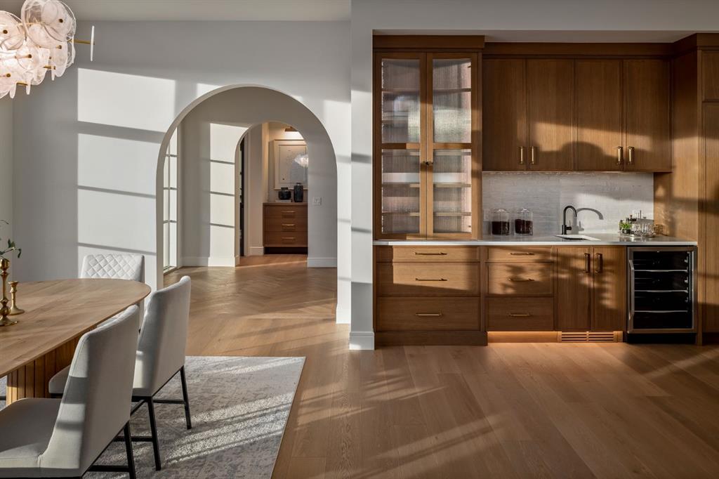 OPEN HOUSE: Saturday Feb 28th 12-2PM and Sunday Mar 1st 12-2PM! Homes on this exclusive ridge rarely come to market, and this breathtaking two-storey estate is a shining example of elevated inner-city living. With 5,545.89 sq.ft. of exquisitely developed space, this 6 bedroom, 5.5 bath residence blends refined craftsmanship with functional luxury; set against a backdrop of sweeping valley and park views. Step inside to soaring ceilings, pristine engineered hardwood floors, and custom archway details that frame each thoughtfully designed space. The heart of the home begins in the sunlit dining area, perfect for hosting epic dinner parties, and highlighted by west-facing triple-glazed LUX windows. The adjacent chef’s kitchen impresses with stainless steel integrated appliances, including a Wolf gas cooktop, double wall ovens, classic white shaker cabinetry, and a hidden butler’s pantry for discreet prep and storage. The expansive great room invites relaxation with vaulted ceilings and a cozy microcement faced gas fireplace, opening directly to a sunny south-facing deck overlooking endless green space. A main floor guest suite (or executive office) with a private ensuite, a designer powder room, and a spacious mudroom with built-ins complete this level. The fully insulated triple car garage is EV-ready and lift-kit friendly, marrying form and function. Upstairs, a serene primary retreat features elegant vaulted ceilings, a custom walk-in closet, and a spa-inspired 5-piece ensuite with a soaker tub, dual vanities, and a glass shower with bench and niche. Three additional bedrooms (one with an ensuite), an upper laundry room with sink and storage, and a charming library nook provide comfort and convenience for the entire family. The fully developed basement is an entertainer’s dream: featuring a large media lounge, games area, wet bar with brick backsplash and undermount lighting, and a high calibre wine room that secretly accesses the highly systemized maintenance room. A versatile home gym, sixth bedroom with walk-in closet, and additional full bathroom on this level ensure guests feel at home. Noteworthy highlights include: Hydronic in-floor heat in the basement; 2 High-Efficiency furnaces & A/C units; built-in speakers throughout; and quartz countertops in all bathrooms. Located minutes from the University of Calgary, Foothills Hospital, and local shops and restaurants, this timeless home sits in a top-tier school catchment and offers quick access to major routes while maintaining a tranquil, park-like setting. A truly unique opportunity to own a well-appointed, move-in ready home in one of the city’s most prestigious enclaves.