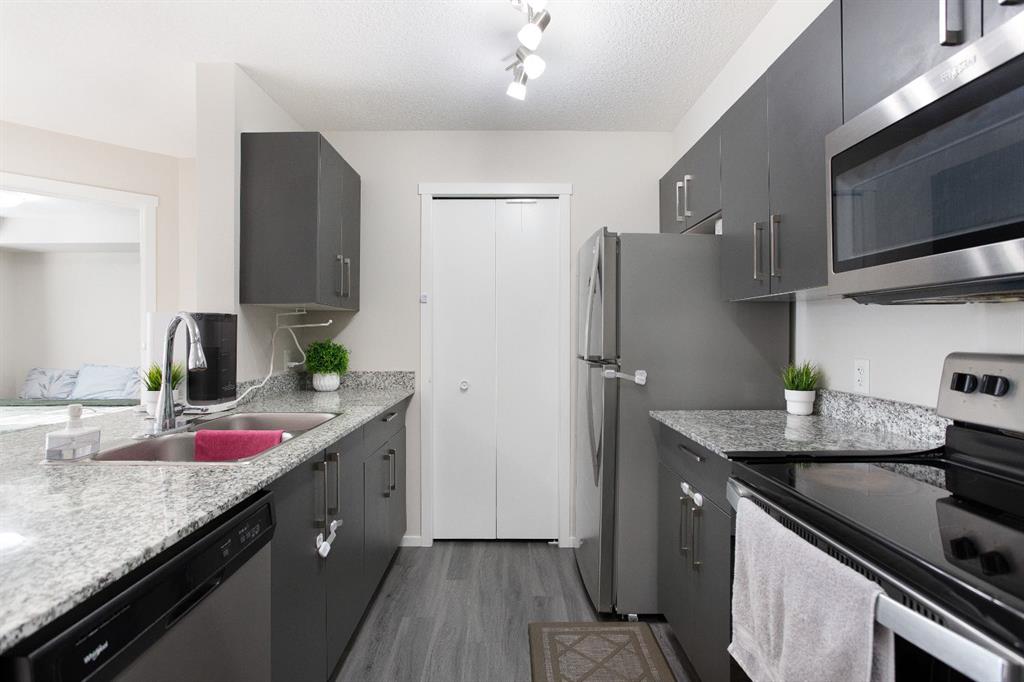 The primary bedroom includes a walk-through closet and private ensuite. A second bedroom and full bathroom provide excellent privacy for guests, roommates or family. Additional features include in-suite laundry, luxury vinyl plank and carpet flooring. Visitor parking is available.