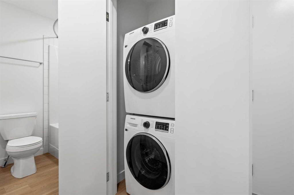 The open-concept design flows seamlessly into the living area at the back of the home, where large windows and direct access to the private balcony create a bright and inviting space—perfect for relaxing, entertaining, or enjoying summer evenings. The bedroom is conveniently located just off the kitchen and offers a comfortable retreat, complete with a walk-in closet. The walk-through closet leads into the bathroom, which also provides access from the foyer for added convenience. In-suite washer and dryer are located here as well, maximizing efficiency without sacrificing space.