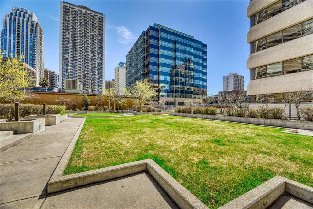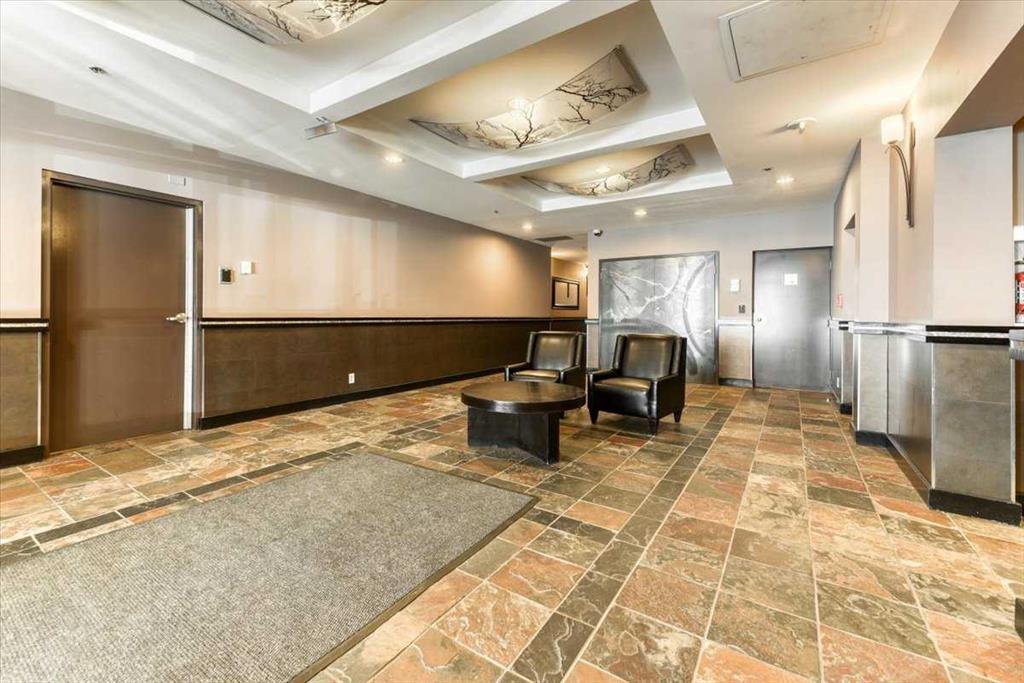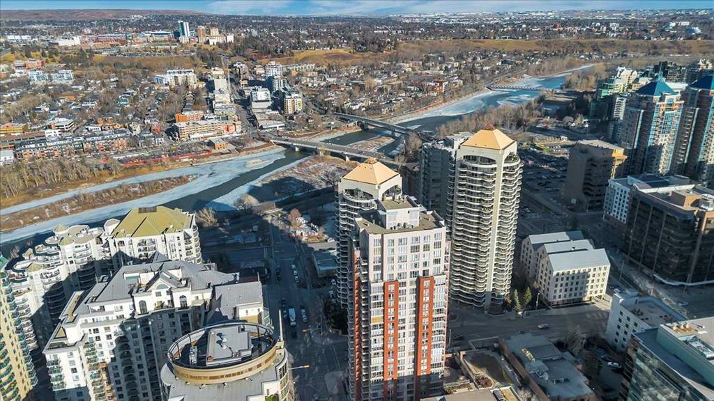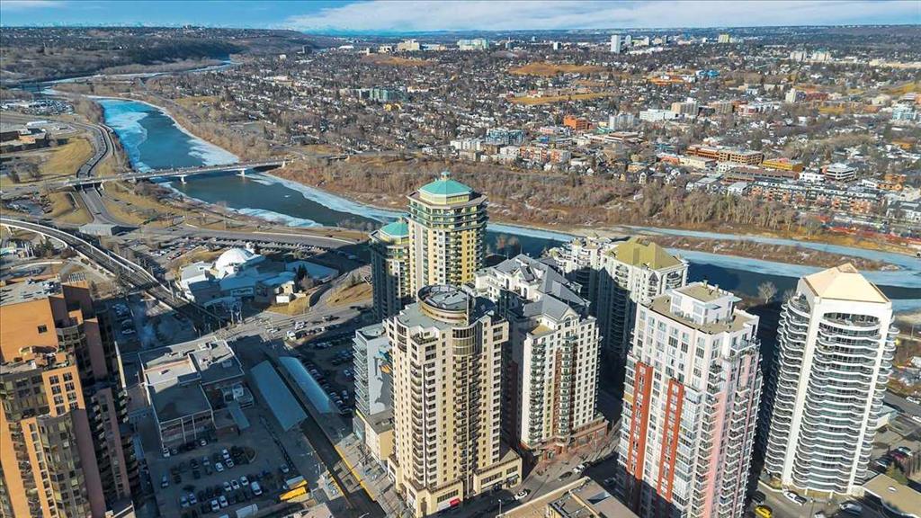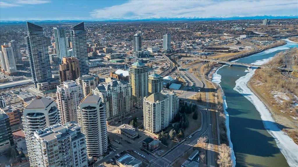 Just imagine working from home, meditating, painting, writing, or just relaxing in a glass-enclosed space with an 8th floor river view that is drenched in natural light during the day, and offers a 'sky-scape' view of Calgary's downtown West End at night. At just slightly below 775 square feet of living space, this one-bedroom plus a den is an affordable starter in one of Calgary's most desirable Inner-city neighbourhoods. Within walking distance to a scenic expanse of bike paths along the Bow River walkway, coffee shops, and restaurants, this unit is ideally located for anyone wanting to be in the heart of the City while, at the same time, being just steps away from nature. The unit itself is bright and open with a kitchen and breakfast bar, a large dining and living area, featuring an expansive wall of windows and an inviting, corner tile-faced fireplace. From both this area and the primary bedroom, you have access to the Den/Office/Sunroom. This extra living space is unique and inviting, with an abundance of windows; It is saturated with loads of natural light. The flooring consists of a neutral, sandy-coloured chestnut laminate for the entire living area, tiles in the front entrance, kitchen, and den, and carpet in the large bedroom. The unit also features in-suite laundry, one assigned underground parking stall and extra storage, all completely enclosed to ensure privacy for your contents. The Axxis includes security, a generous amenity/ party room, a gym, a spacious outside living area, and a designated space for any deliveries you have coming. Rare and seldomly available at such a desirable price point, this is an exceptional opportunity for anyone who'd love to affordably become a homeowner and step away from contributing to someone else's investment portfolio. Book your showing today!