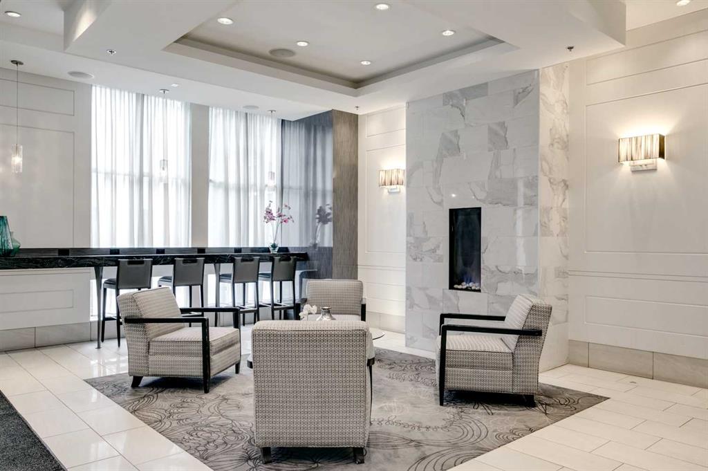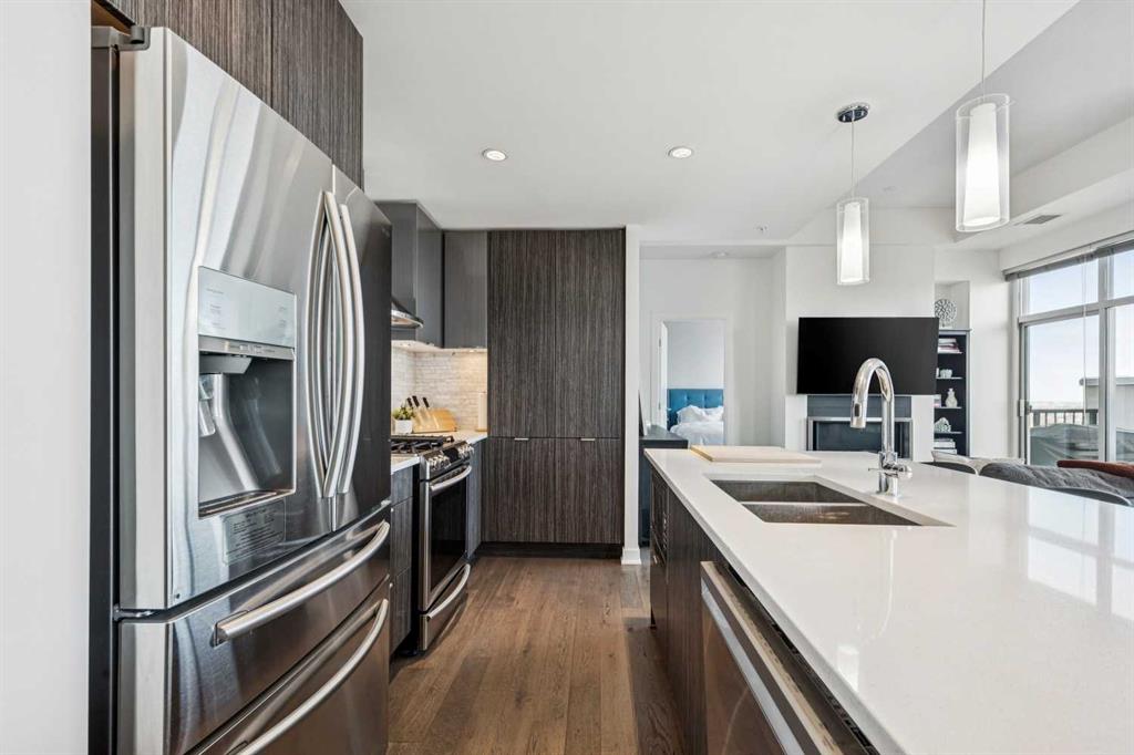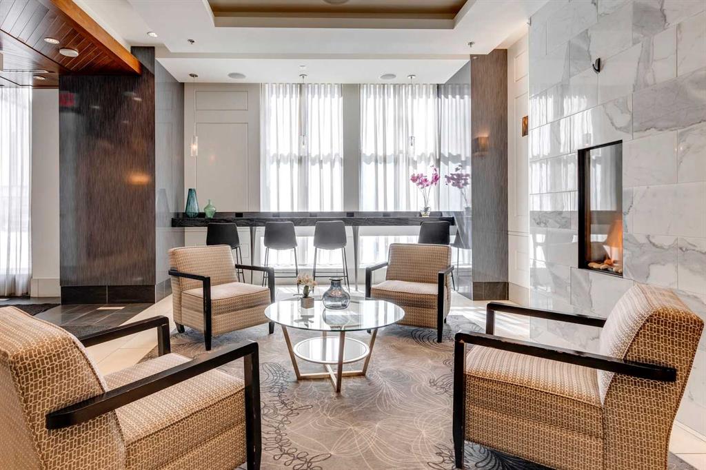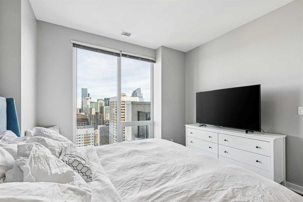 Experience elevated penthouse living at The Vogue, perched high above the city’s financial core. This rare 2 bedroom, 2 bathroom residence features soaring vaulted ceilings, floor-to-ceiling windows, and TWO well-placed balconies that capture sweeping urban views, river views, and natural light throughout the day. The thoughtfully designed layout includes a spacious primary retreat with a walk-in closet and an exceptional 5-piece ensuite with double vanity, a separate in-unit laundry room, and open-concept living ideal for both everyday comfort and entertaining. Offered in only a limited number of high-rise units, this penthouse delivers a truly exclusive living experience. Completing the package are TWO TITLED underground parking stalls (UNITS 1 & 2) with immediate access from the parkade entrance - a rare and valuable convenience in the downtown core.