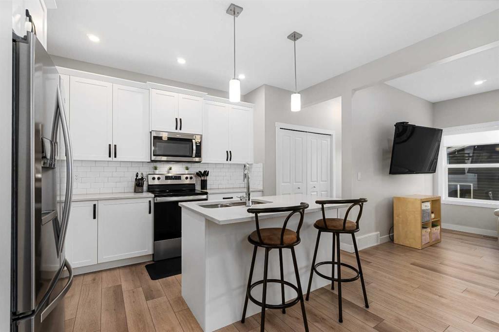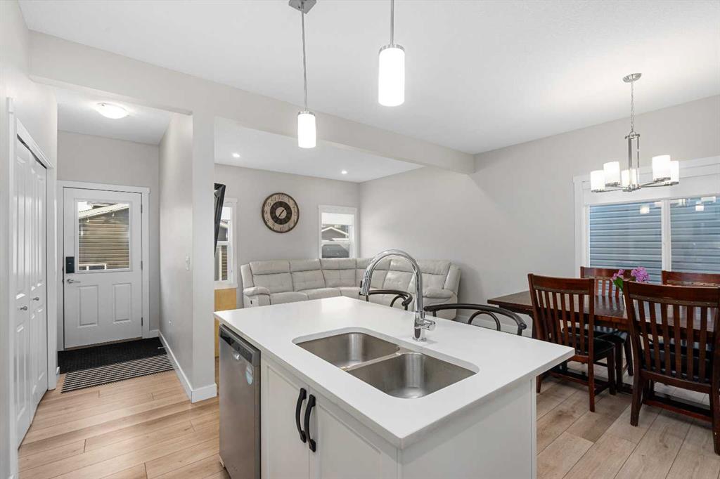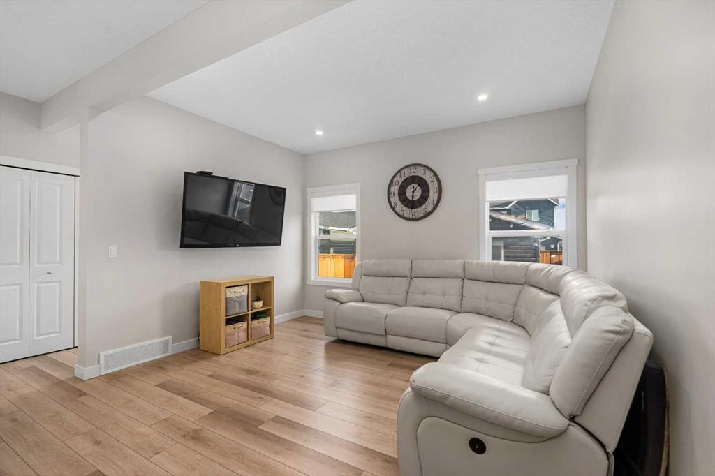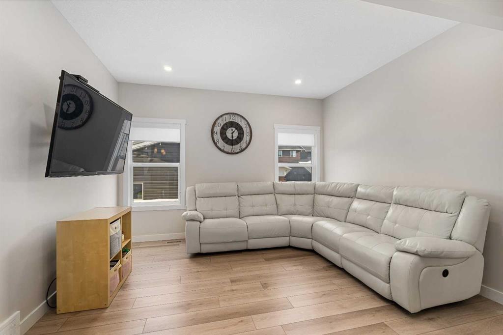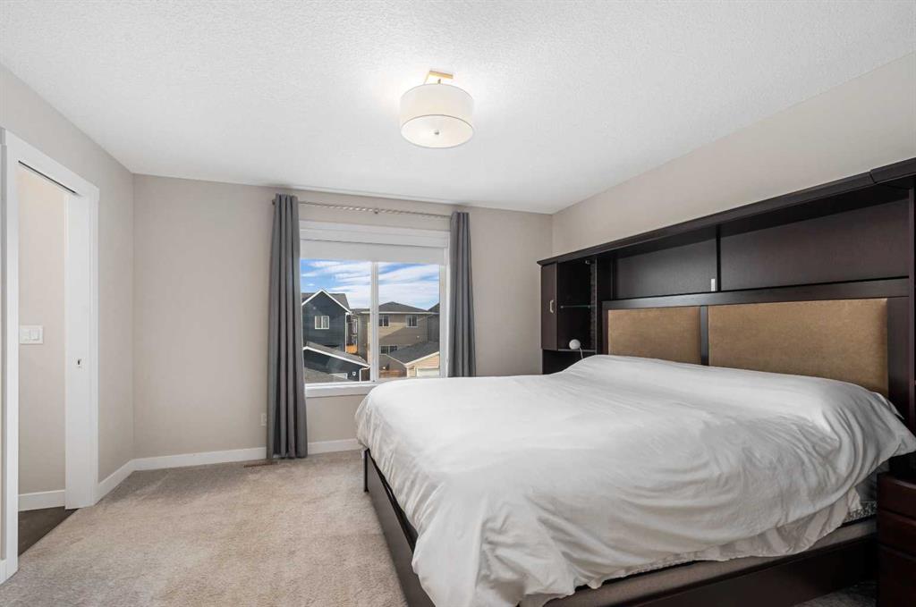 DIRECTLY ACROSS FROM GREENSPACE - FULLY FINISHED - NEW A/C - NEW GARAGE & BASEMENT Move-in ready and beautifully maintained, this stylish original-owner home delivers modern comfort and everyday functionality with nearly 2,500 sq. ft. of fully developed living space. Thoughtful upgrades enhance the home throughout, including air conditioning with a value of $7K in 2022, an extra-thick underlay for the basement carpet, a fully finished permitted basement completed in 2024 ($35K update), and a brick paver patio ideal for outdoor enjoyment, another $13K upgrade! Upon entry, you’re welcomed by an abundance of natural light from west-facing windows in the front side room, offering open views of the expansive green space directly across the street! Designed with connection in mind, the main floor features an inviting living room accented by rich vinyl plank flooring, while the impressive kitchen stands out with the center island perfect for gathering, quartz countertops, and stainless steel appliances that tie the space together seamlessly. The generous dining area flows directly to the backyard, where a sun-filled brick paver patio creates the perfect setting for morning coffee, summer barbecues, and effortless outdoor living. At the rear of the property, a fully finished double detached garage with beautiful epoxy flooring provides the dream workshop, ample storage, and year-round vehicle protection, also a $35K upgrade! Upstairs, the primary bedroom serves as a relaxing retreat complete with a stylish ensuite, while two additional bedrooms and a full bathroom offer space for family, guests, or a home office. The fully finished basement adds versatility and comfort, ideal for movie nights, a kids’ play area, or a quiet workspace, along with a spacious fourth bedroom for added flexibility. Located in the welcoming, family-oriented community of Bayview, this home is just steps from parks, playgrounds, walking and biking paths, schools, transit, shopping and amenities found throughout SW Airdrie. Don't miss the chance to see it for yourself, book your private viewing today!