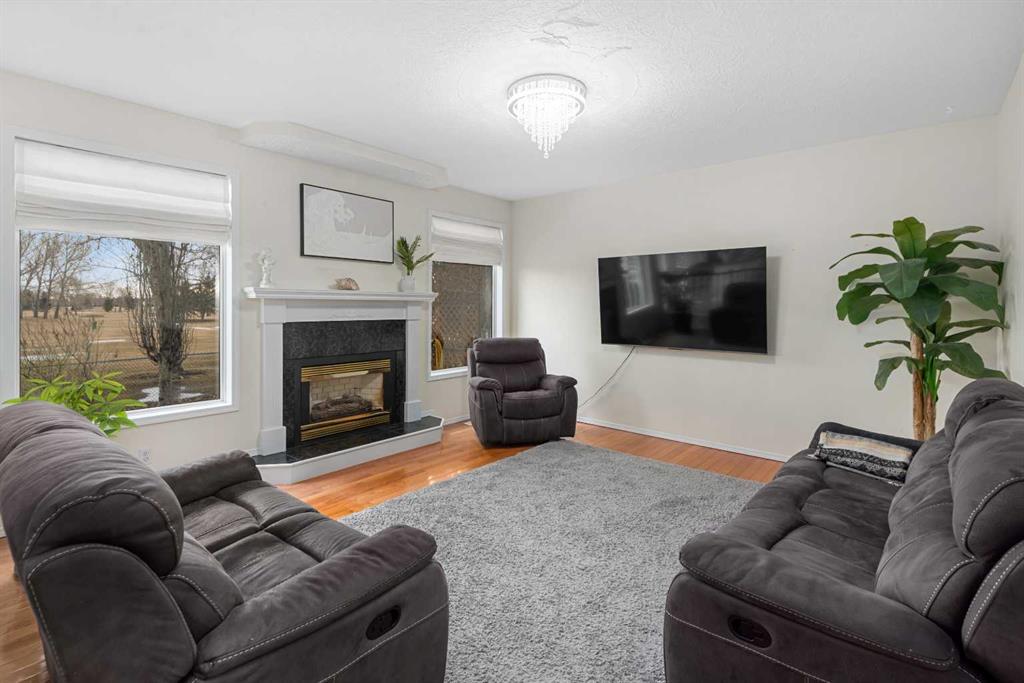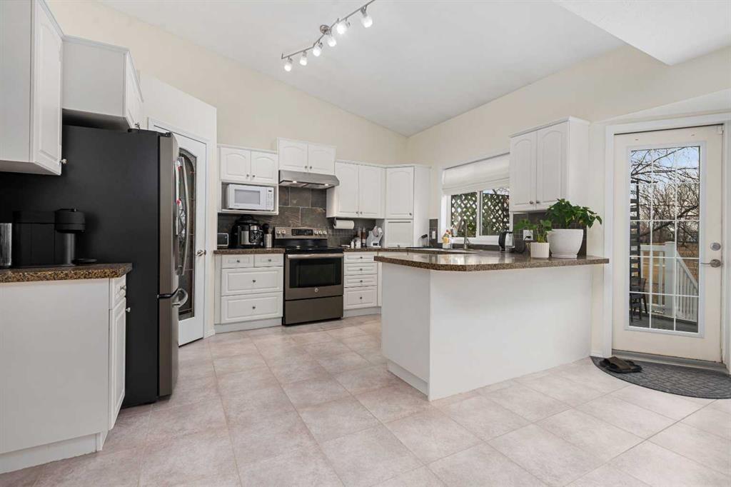 Upon entry, you’re greeted by high vaulted ceilings in the living room, dining area, and kitchen, creating an airy and welcoming atmosphere. Large windows fill the home with natural light, enhancing the open and spacious feel throughout. The main floor offers a cozy sunken family room with a gas fireplace, perfect for relaxing evenings, as well as a versatile main floor bedroom ideal for a home office or guest room.