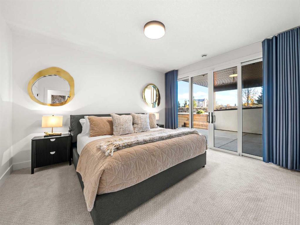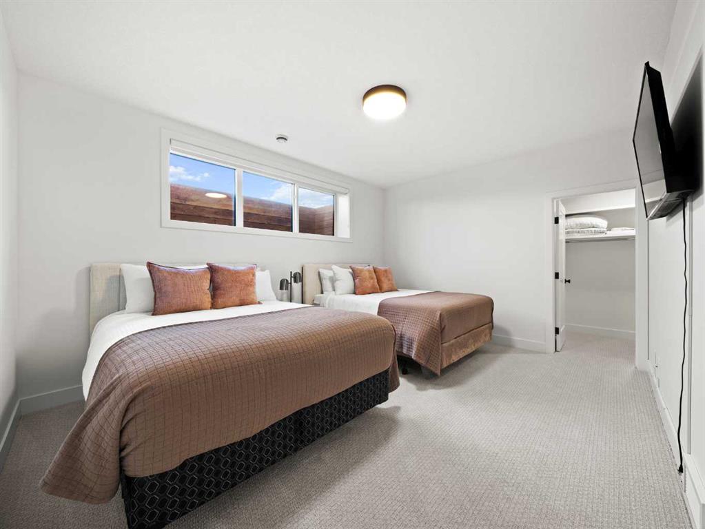 The main-floor primary suite feels like a private retreat with vaulted ceilings, a fireplace, and a private covered deck for morning coffee or evening wine. The spa-like ensuite features a freestanding tub with mountain views, a glass-enclosed steam shower, and a massive walk-in closet with custom built-ins.