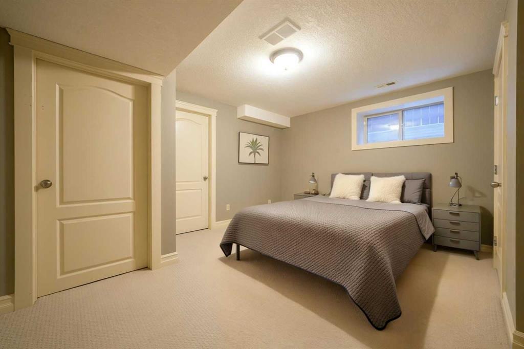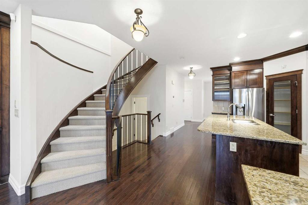 Additional features include central A/C, full-height custom cabinetry, built-in great room cabinets, a skylight above the staircase, gas line to BBQ, central vacuum rough-in, rear deck, window coverings throughout, and 9-foot main-floor ceilings. All of this is located just minutes from the city core.