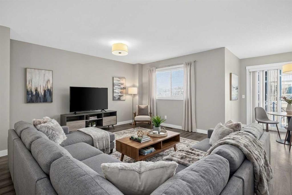 Welcome to Skyview Ranch Grove — a beautifully maintained multi-level townhouse offering modern finishes, smart design, and comfortable everyday living. From the moment you step inside, you’ll notice the pride of ownership and lightly lived-in condition that gives this home the feel of a new build. Contemporary cabinetry, quality flooring, and sleek countertops create a clean, modern aesthetic that’s both stylish and practical. The main living level is thoughtfully designed with an open-concept layout where the living room, dining area, and kitchen flow seamlessly together. High ceilings enhance the sense of space and allow natural light to move freely throughout. Whether you're entertaining guests or enjoying a quiet evening at home, the layout keeps everyone connected while still feeling spacious and comfortable. The kitchen is generously sized and highly functional, offering ample counter space, modern cabinetry, and excellent ventilation. It’s designed for real life — easy meal prep, everyday organization, and effortless hosting. A built-in Heat Recovery Ventilator (HRV) improves air quality and energy efficiency year-round. Upstairs, you’ll find two well-sized bedrooms that provide flexibility for a variety of needs. The primary bedroom offers a comfortable retreat with plenty of room for a full bedroom set, while the second bedroom works perfectly as a guest room, child’s room, or home office. Two bathrooms help keep daily routines running smoothly. Ideally located near parks, walking paths, K–9 schools including Apostles of Jesus and Prairie Sky School, and major amenities such as CrossIron Mills and the airport, this home offers convenience without sacrificing comfort. Modern, functional, and move-in ready — a perfect fit for first-time buyers, young families, or investors looking for quality in a growing community.