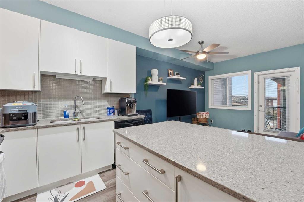 Welcome to this stunning condo situated on the inside corner of the top floor in the heart of Sage Hill. This unique placement provides exceptional privacy and tranquility, making it an ideal retreat from the hustle and bustle of everyday life. This 1-bedroom, 1.5-bathroom unit features a thoughtfully designed, open-concept layout with soaring 9-foot ceilings. The bright and airy atmosphere is enhanced by the seamless flow between living spaces, creating an inviting environment perfect for both relaxing and entertaining. The kitchen boasts white cabinetry, elegant stone countertops, and stainless-steel appliances. A massive island serves as the focal point, connecting the kitchen with the spacious living area—ideal for cooking, entertaining guests, or enjoying a morning coffee. The convenient half-bath off the living room offers easy access for visitors. The primary bedroom is generously sized, offering plenty of room for a king-sized bed and a home office setup if desired. It includes a beautiful 4-piece ensuite bathroom and a large walk-in closet, ensuring ample storage for personal belongings. Enjoy the convenience of in-suite laundry and a covered private balcony, perfect for relaxing and taking in picturesque views. The unit also includes a titled underground heated parking stall—an invaluable feature during Calgary’s colder months—and secure bike storage within the building. This apartment is ideally located just minutes away from a variety of essential amenities, like Super Walmart Centre, Costco, Pharmacies, Clinics, Restaurants, major Highways Stoney and Shaganappi, making daily life comfortable and convenient.