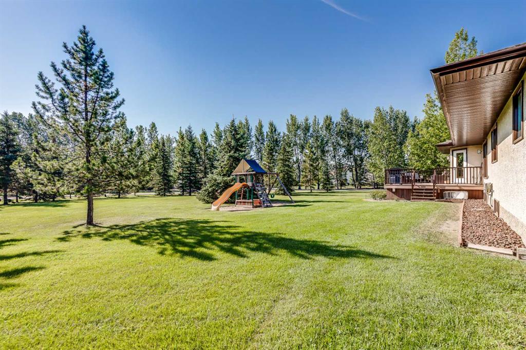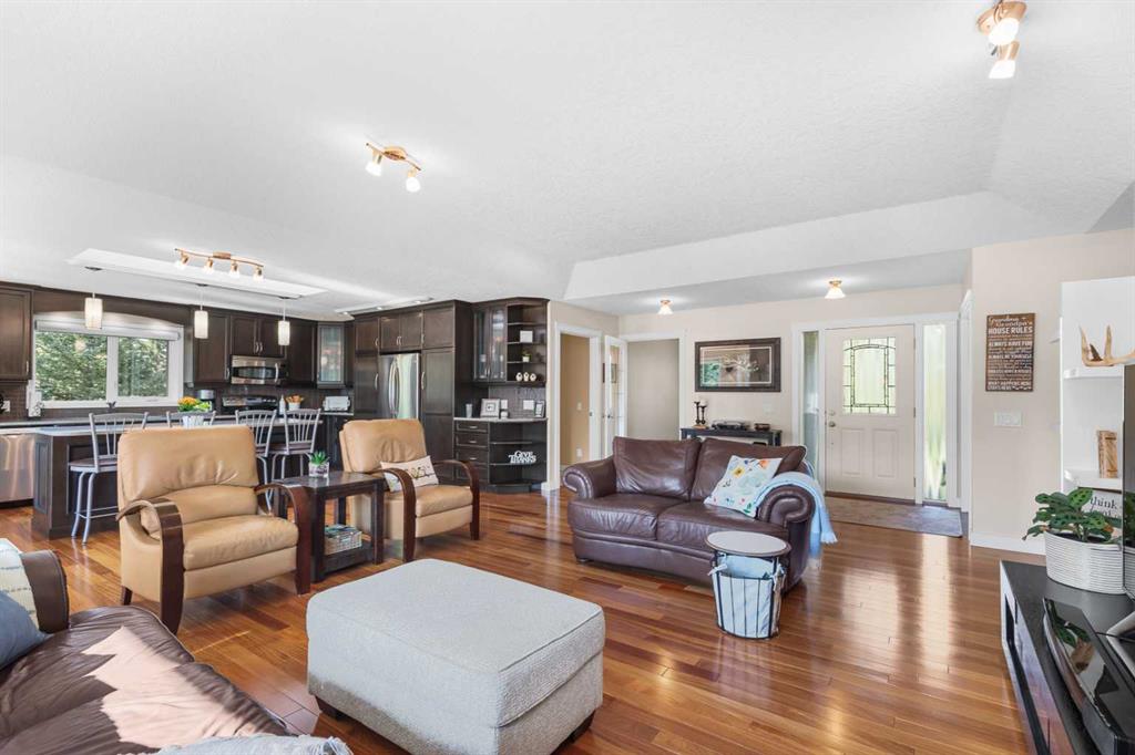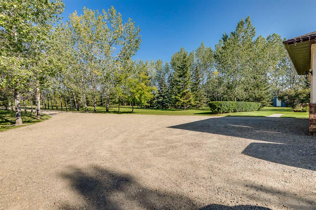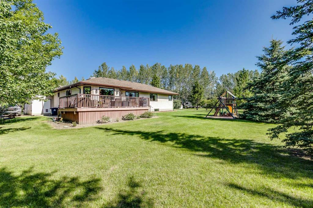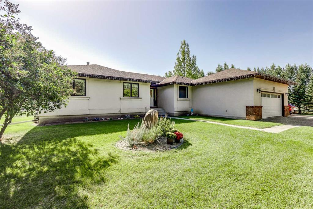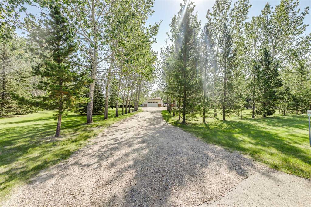 OPEN HOUSE: Sun., Feb 15: 1-3pm! Set among rolling hills just southeast of Airdrie, this exceptional 5 bed, 4 bath contemporary bungalow rests on a meticulously landscaped acreage designed for privacy and tranquility. Over 400 mature trees, thoughtfully planted more than two decades ago, now surround the home in a natural, park-like sanctuary. Renovated with intention and quality, the residence blends modern design with timeless appeal. Notable updates include: triple-pane windows, Brazilian teak hardwood flooring a chef-inspired kitchen with custom cabinetry, quartz countertops and premium stainless steel appliances. The main-floor primary suite offers a spa-like escape with double sinks, a freestanding soaker tub and a separate glass shower. The fully developed basement boasts a spacious recreational space, 2 large bedrooms, full bath and loads of storage. Completing the property are an attached, heated double garage, a high-producing, water well and a recently updated septic tank and field and no Poly-B, ensuring independence, efficiency, and peace of mind. All systems have been regularly maintained and well cared for. Acreage properties of this caliber are rarely available.