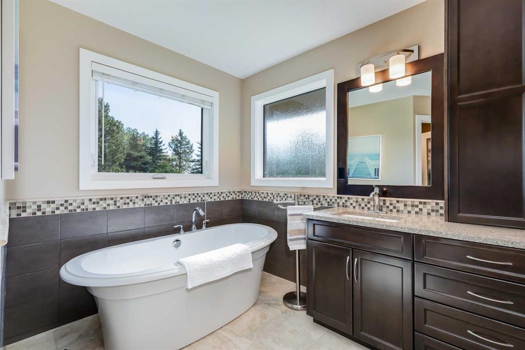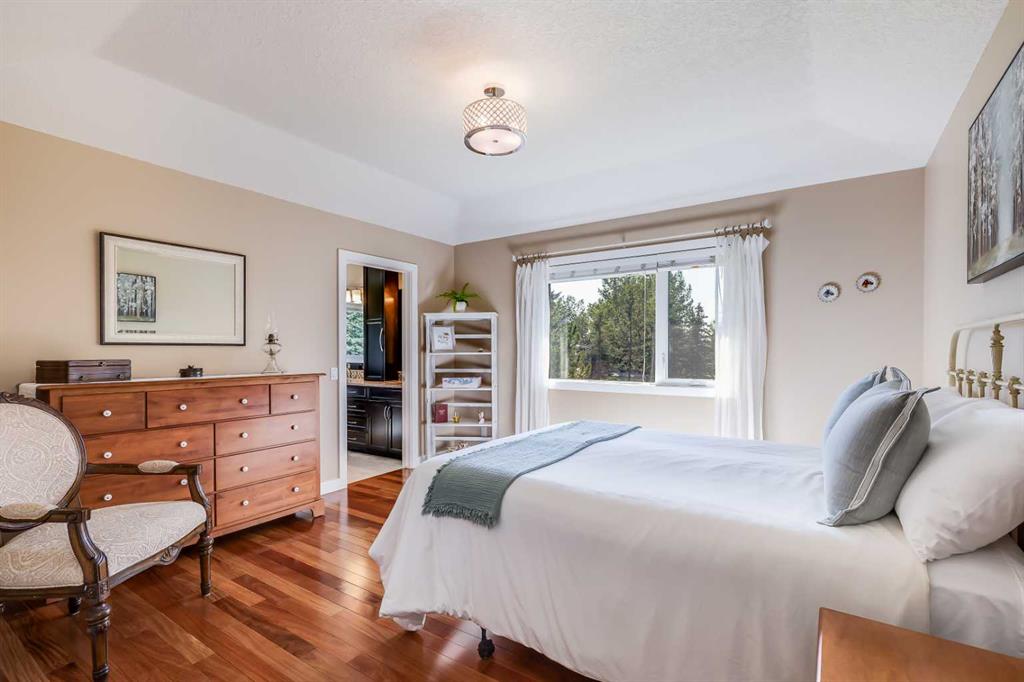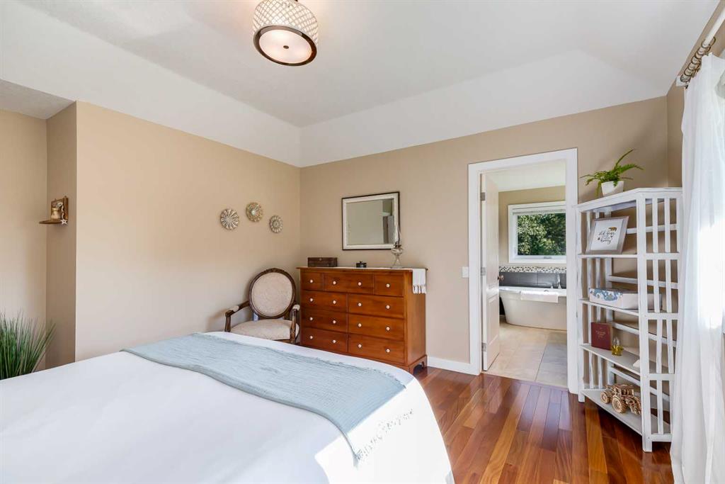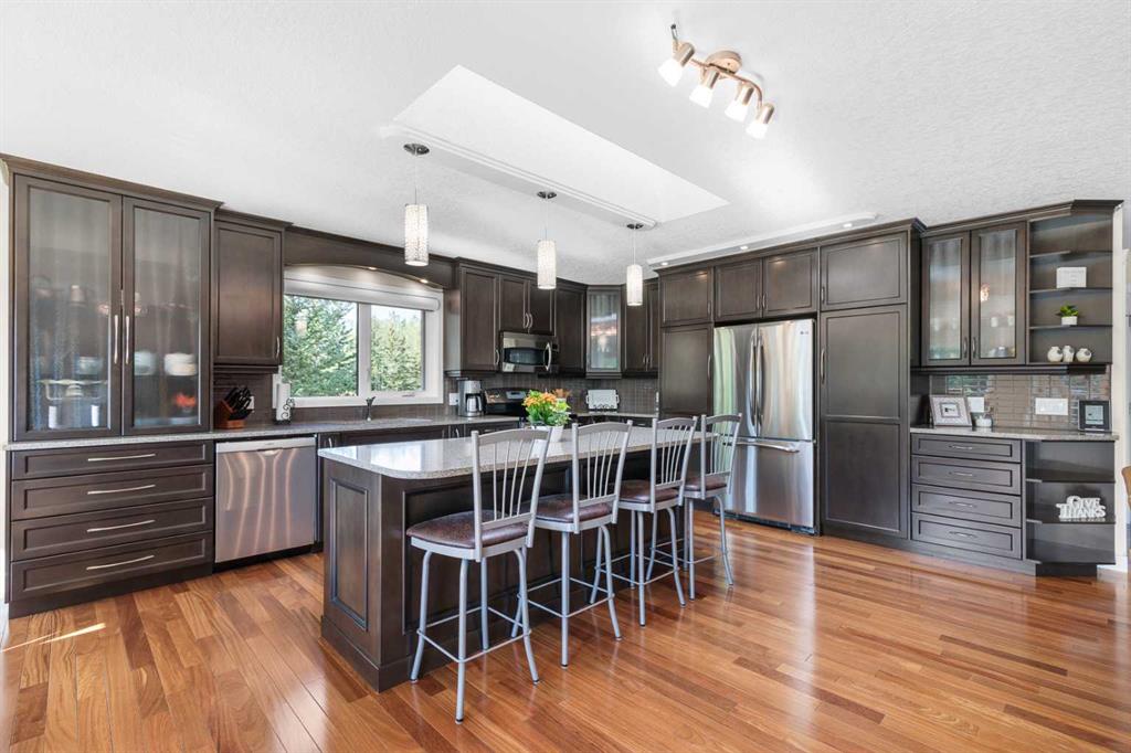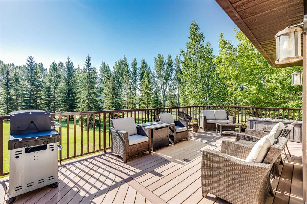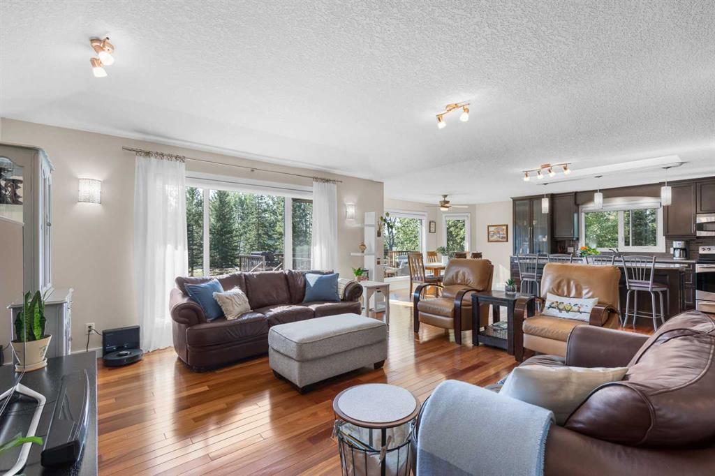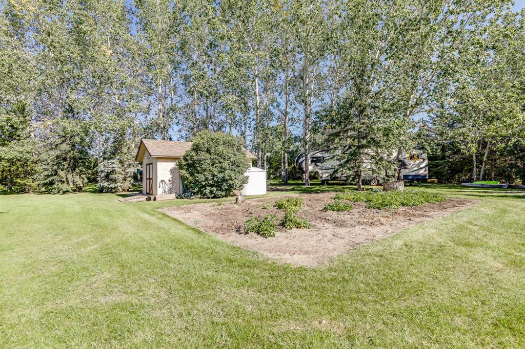 OPEN HOUSE: Sun., Feb 15: 1-3pm! Set among rolling hills just southeast of Airdrie, this exceptional 5 bed, 4 bath contemporary bungalow rests on a meticulously landscaped acreage designed for privacy and tranquility. Over 400 mature trees, thoughtfully planted more than two decades ago, now surround the home in a natural, park-like sanctuary. Renovated with intention and quality, the residence blends modern design with timeless appeal. Notable updates include: triple-pane windows, Brazilian teak hardwood flooring a chef-inspired kitchen with custom cabinetry, quartz countertops and premium stainless steel appliances. The main-floor primary suite offers a spa-like escape with double sinks, a freestanding soaker tub and a separate glass shower. The fully developed basement boasts a spacious recreational space, 2 large bedrooms, full bath and loads of storage. Completing the property are an attached, heated double garage, a high-producing, water well and a recently updated septic tank and field and no Poly-B, ensuring independence, efficiency, and peace of mind. All systems have been regularly maintained and well cared for. Acreage properties of this caliber are rarely available.