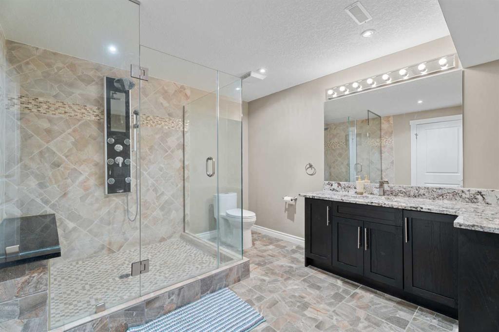 Welcome home to Aspen Woods in your new 5-bedroom + office house with over 2700 sq ft of above-grade space plus a finished basement. This executive air-conditioned home is on a large pie-shaped lot with no neighbours behind and on a quiet cul-de-sac on a no-through road with a playground around the corner. The main floor of the home has an inviting foyer with freshly painted double doors (this makes moving large items a breeze) and two closets, including a rare walk-in closet at the entry. Notably, this home is entirely carpet-free: cherry hardwood on the main floor, oak hardwood upstairs, and durable vinyl plank in the basement. There is a formal dining room and a private office on the main floor plus a spacious kitchen/dining/living room. The oversized garage has tall ceilings and could fit a small lift. The laundry is located off the entry to the garage with more closet space. The chef’s kitchen has an enormous island with a matching kitchen table that can be used as an extension of the island. There is a gas range, multiple pantries, a trash compactor, a wine fridge, display areas, and more! You can also catch glimpses of the mountains while sitting at the kitchen table. The living room has built-in wall shelves, a gas fireplace, and big windows to the east. The backyard is designed for both relaxation and play, with a two-tier deck, large shed, play structure, mature landscaping, and two productive apple trees—all on a nearly 7,000 sq. ft. lot. Upstairs is extremely spacious with a large bonus room with vaulted ceilings and built-in shelving, a grand primary bedroom, and three secondary bedrooms. The primary bedroom gets warm morning light and has a 5-piece ensuite and a walk-in closet with custom organizers. The remaining 3 bedrooms upstairs share a bathroom with dual sinks and a separate area for the bathtub & toilet. The westerly bedrooms have great views of the Rockies and Foothills to wake up to. The upper two floors also have built-in ceiling speakers. The fully finished basement includes a fifth bedroom with a built-in sink (ideal for a home-based business requiring a sink), a spa-inspired bathroom with multi-head shower, a wet bar, large bright windows, and ample storage, including a finished space under the stairs. Aspen Woods is a premier neighbourhood of Calgary with lots of local shops, quick access to the mountains, and a choice selection of schools, including Webber Academy, Rundle College, Guardian Angel Catholic, and Dr. Roberta Bondar Elementary. This stately Aspen Woods property blends elegance, functionality, and family-friendly features—ready to welcome you home.
