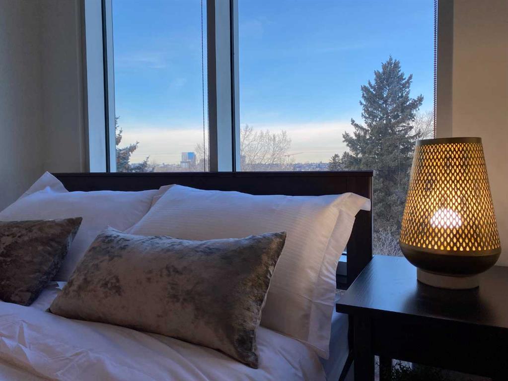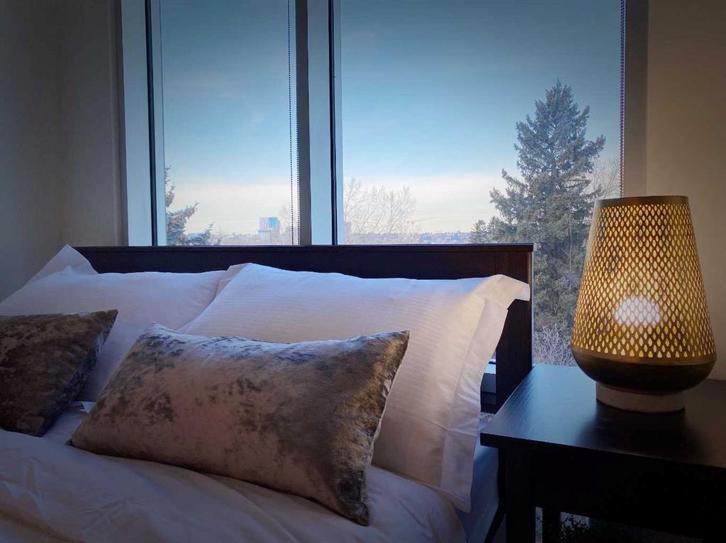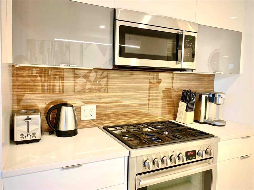The Avli on Atlantic — Located in the heart of the iconic Inglewood community at the confluence of the Bow and Elbow Rivers, this exquisite 2-bedroom, 2-bathroom condo offers refined inner-city living. The home features sleek tiled flooring throughout and a stylish European-inspired kitchen complete with an integrated refrigerator and dishwasher, luminous white quartz countertops with a central island, and stainless steel appliances, including a five-burner gas stove and microwave range hood.