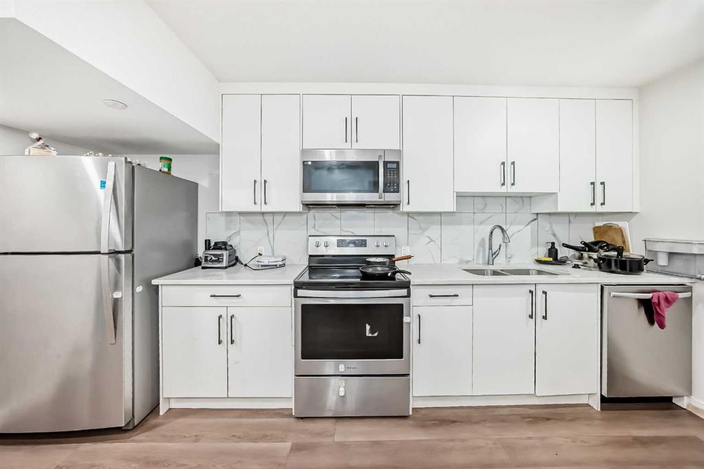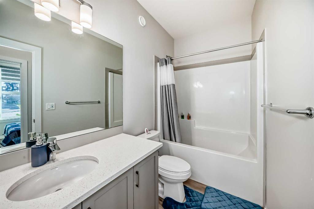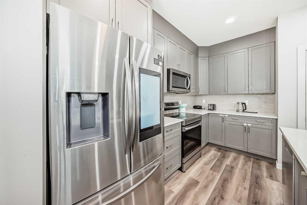 The thoughtfully designed main floor welcomes you with an open-concept kitchen featuring quartz countertops, stainless steel appliances, and an oversized island—perfect for both everyday living and entertaining. A main-floor bedroom and full bathroom offer flexible space for guests or multi-generational families.
