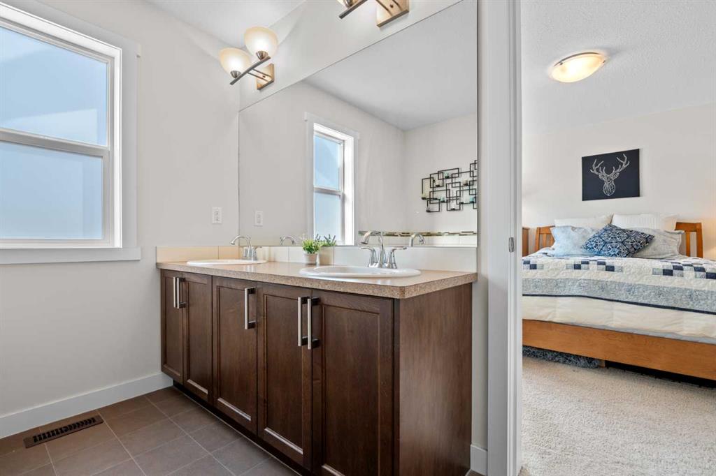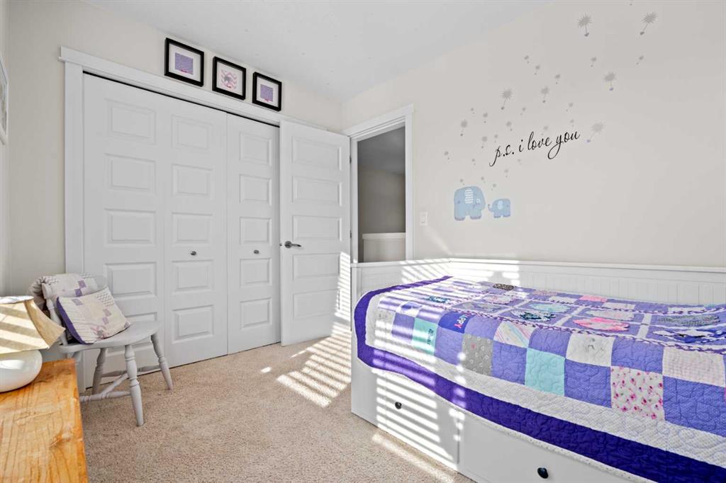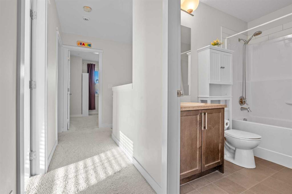 Welcome to this beautifully maintained, original-owner home, perfectly situated on a quiet CORNER LOT beside a scenic WALKING PATH. Thoughtfully designed and ideally located, it’s just STEPS from a SCHOOL, PLAYGROUND, POND, PARK, and a protected nature preserve. Inside, the 9-ft ceilings and open floor plan create a bright, welcoming atmosphere. The main level includes a versatile OFFICE/DEN, a modern kitchen with STAINLESS STEEL APPLIANCES that flows seamlessly into the dining area, and a comfortable living room centered around a cozy FIREPLACE. A convenient powder room and a well-organized mudroom, with both a closet and pantry, add everyday practicality. The backyard offers a generous outdoor space with a huge DECK, SHED, playhouse/platform, and GARDEN BOXES filled with assorted herbs. As spring arrives, the property comes alive with raspberry and haskap bushes, rose bushes, mountain ash, Bailey’s Schubert, Japanese lilac trees, and a charming crabapple tree in the front yard. Upstairs, you’ll find three spacious bedrooms and two full bathrooms. Relax with a book in the sitting area next to the window of the primary bedroom, or soak in the tub in the primary ensuite, with dual sinks, and a walk-in closet. A separate upper-level laundry room adds extra convenience. The undeveloped basement features 9-ft ceilings, large windows, and ample room to create additional living space, whether you envision an office, extra bedroom, or a home gym, with mirrors already included. A brand new hot water tank and water softener is also included. Only a quick 20 minute commute to Calgary city limits, this home offers so much value with a wonderful blend of comfort, function, and family-friendly living in a truly inviting setting.