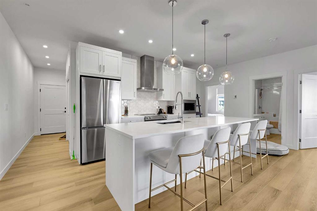 Discover this stylish 916 sq ft, 2 bedroom condo in the heart of one of Calgary’s most walkable communities. This end unit has been extensively upgraded for comfort and design, and offers a premium urban lifestyle. You will be impressed with the beautifully Upgraded Kitchen which includes quartz countertops, custom tile backsplash, and a built in hood fan. The bright, open layout features luxury vinyl plank flooring, large windows and lots of space for comfortable living. The condo is also equipped with central A/C for the hot summer days! The primary bedroom includes a walk-in-closet and a four piece ensuite with a double vanity. There is a second bedroom, a three piece bathroom, in suite laundry and a large balcony to complete this home. Extras include titled underground parking along with an assigned storage unit. Steps from South Health Campus, the YMCA, public library, and local dining/shopping and quick access to Deerfoot and Stoney Trail, you are never far from where you need to go. Book your showing today!
