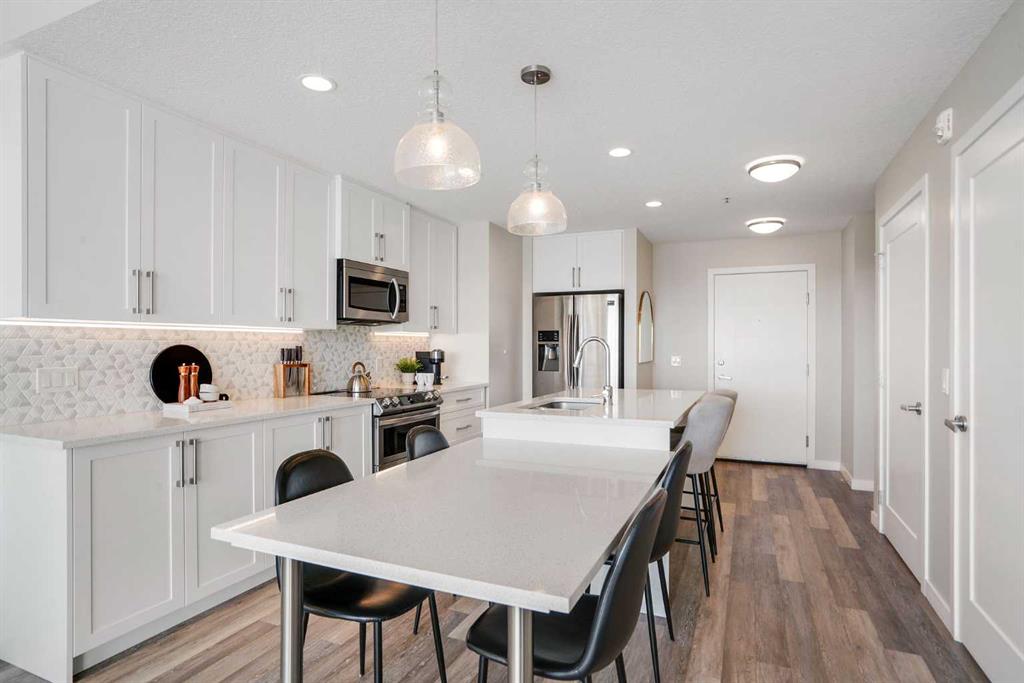 Welcome to Vivace North, where modern design meets effortless everyday living in the heart of West Springs. This beautifully upgraded 2-bedroom, 2-bathroom condo blends style and functionality, creating a home that feels as sophisticated as it is comfortable. The chef-inspired kitchen features sleek stainless steel appliances, full-height white cabinetry, and modern white quartz countertops. The step-down island is both practical and unique, offering bar seating on one side and a built-in dining table on the other, perfect for entertaining or relaxed daily meals. The open-concept living space is warm and inviting, with luxury vinyl plank flooring and large east-facing windows that fill the home with natural light. Step outside onto two private balconies, ideal for morning coffee or evening unwinding. Both bedrooms offer walk-through closets with direct access to bathrooms, while the second room makes a perfect guest bedroom or home office. This unit has NO CARPET and pride of home ownership is evident! Enjoy added convenience with in-suite laundry, a storage locker, bike storage, and tandem double parking stalls. Outside your door, you’re steps away from Mercato West, Vin Room, Blanco, Fergus & Bix, Una Pizza, and more, plus grocery stores, boutique shops, and top-rated schools. Downtown is only 15 minutes away, and the mountains are within easy reach for your next weekend escape. Perfect for investors, first-time buyers, or downsizers, this home at Vivace North combines modern comfort, unbeatable convenience, and the vibrant energy of Calgary’s west end.