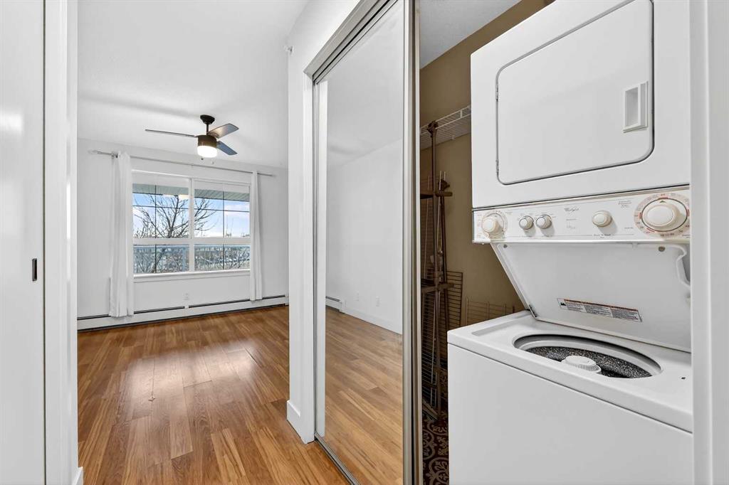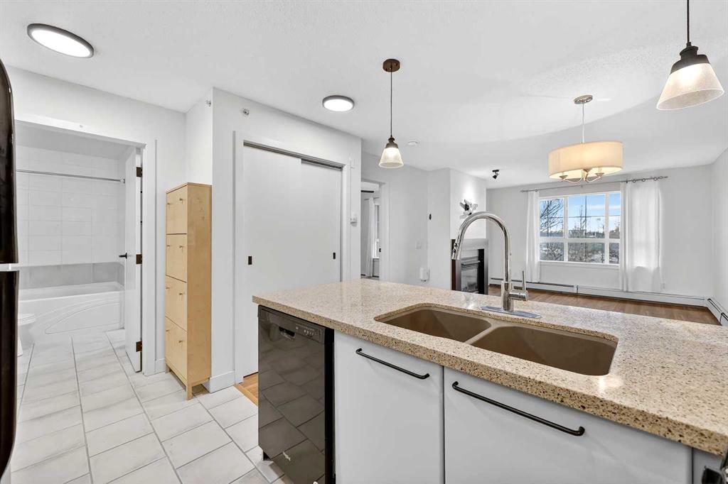 Bright open layout featuring a functional kitchen, spacious living area with cozy gas fireplace, in-suite laundry, full bathroom, and private balcony. Enjoy the added privacy and quiet of fourth-floor living with no neighbours above.