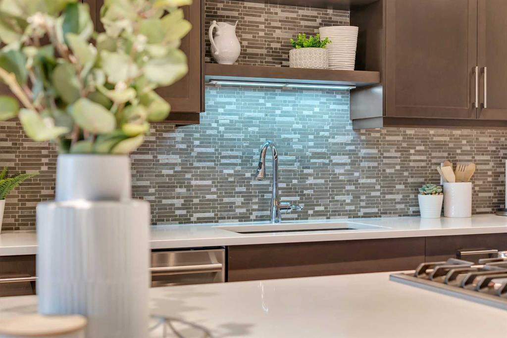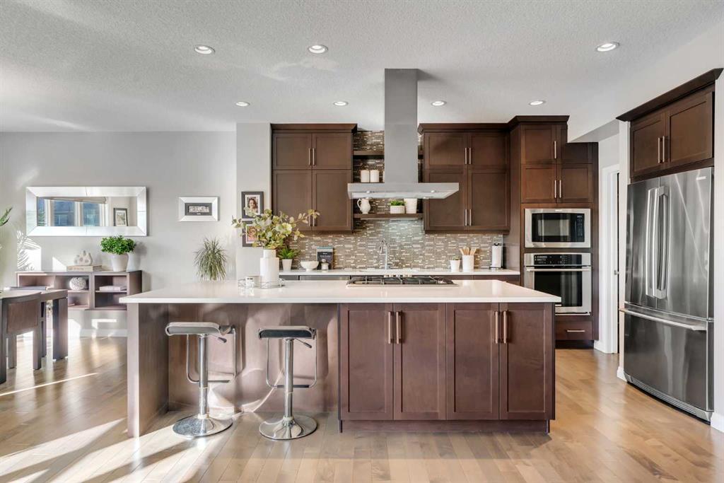 As you enter, you're greeted by a spacious foyer with room for a bench, setting up the tone for the elegant design throughout. The bright & sunny living room features rich hardwood flooring and a cozy gas fireplace, perfect for those chilly winter nights. A statement chef's kitchen crafted for both everyday living & elevated entertaining featuring above the island gas cook top with a custom hood fan, all built in appliances with a newer Bosch dishwasher, pot lights, tons of drawers & cabinet space, floating shelfs adding to the stylish look, a classy and elegant backsplash, and a corner pantry with a glass door. Adjacent to the kitchen is the dining area. All the windows on the main level features towards the rear of the home capturing the stunning pond and mountain views all day long. The rear wide deck is a great spot for your morning coffee while you sit back & enjoy the serene views.