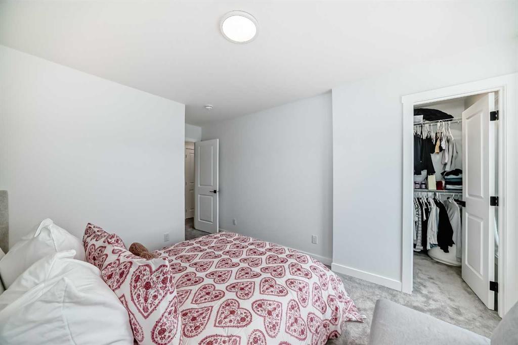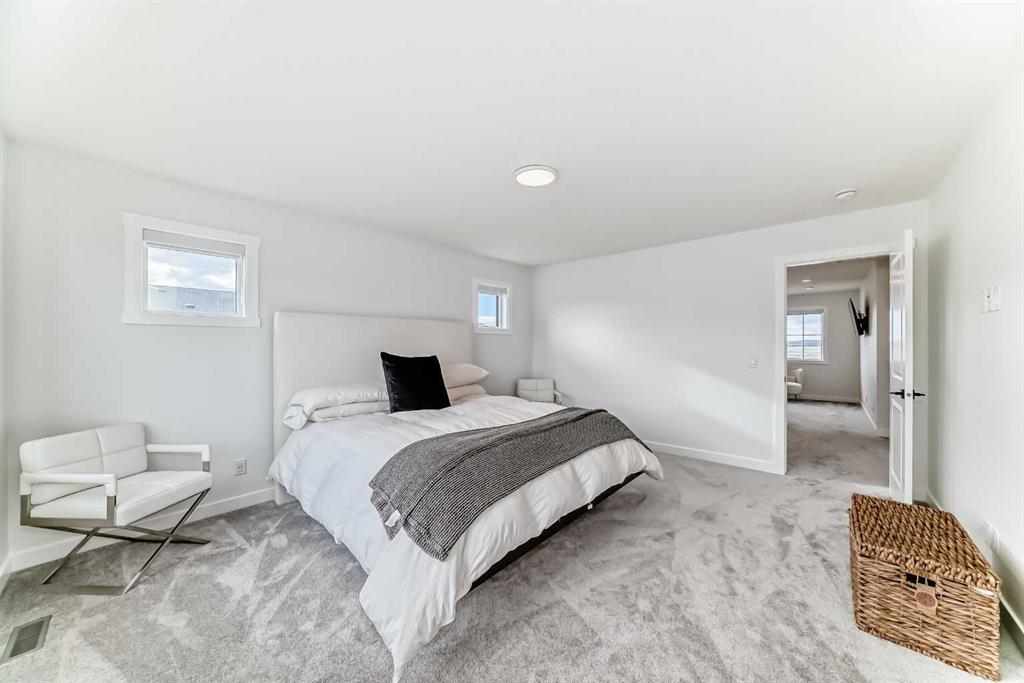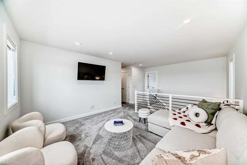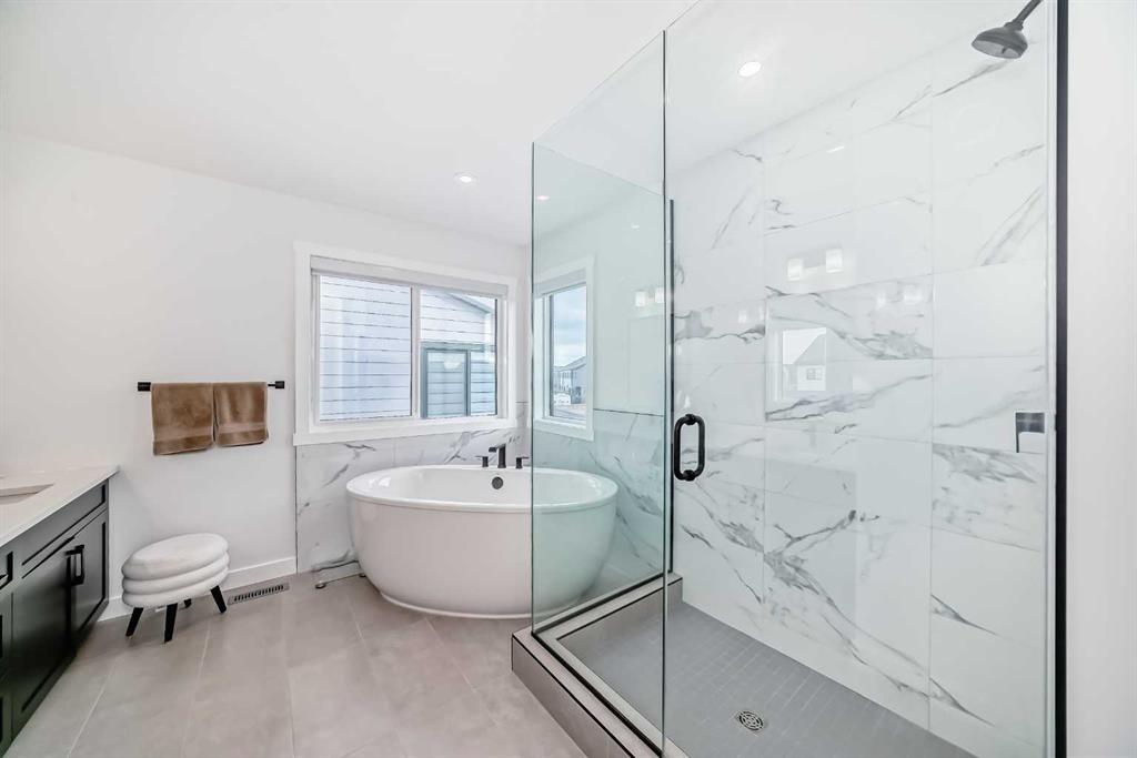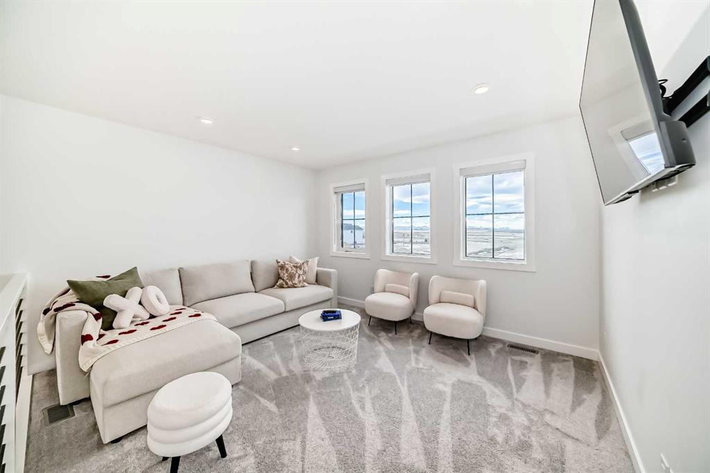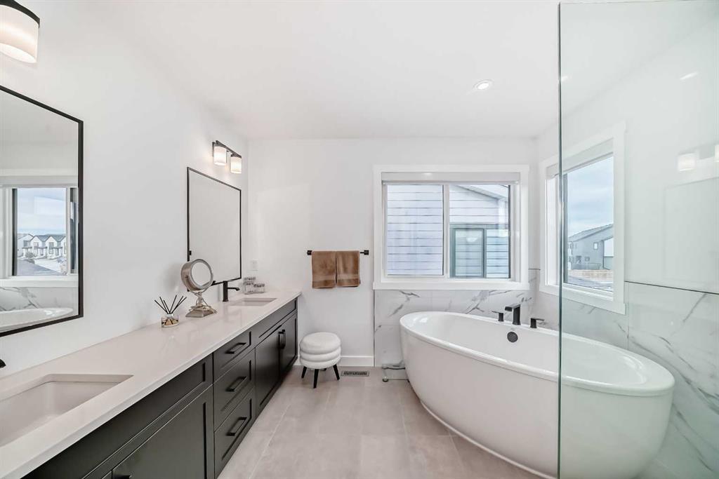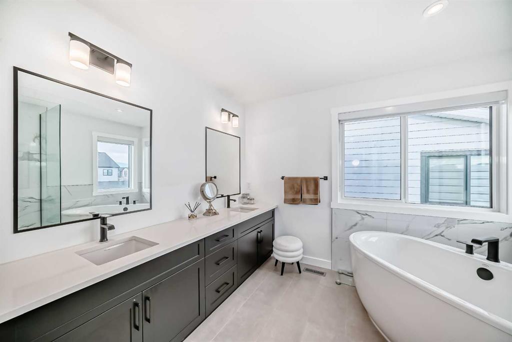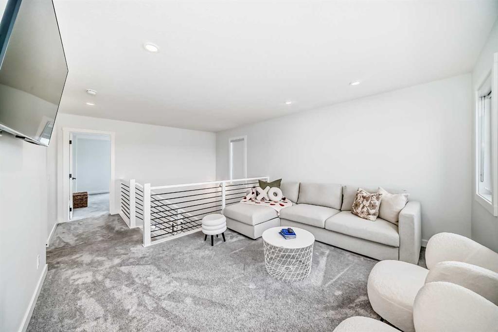 Upstairs, the thoughtful layout continues. The primary bedroom is a true retreat, featuring a luxurious five-piece ensuite with dual vanities, a freestanding tub, a separate shower, and a spacious walk-in closet. A comfortable upper-level family room creates the perfect space for movie nights or quiet downtime. Two additional well-sized bedrooms, each with their own walk-in closets, share a modern four-piece bathroom—ideal for families of all sizes.