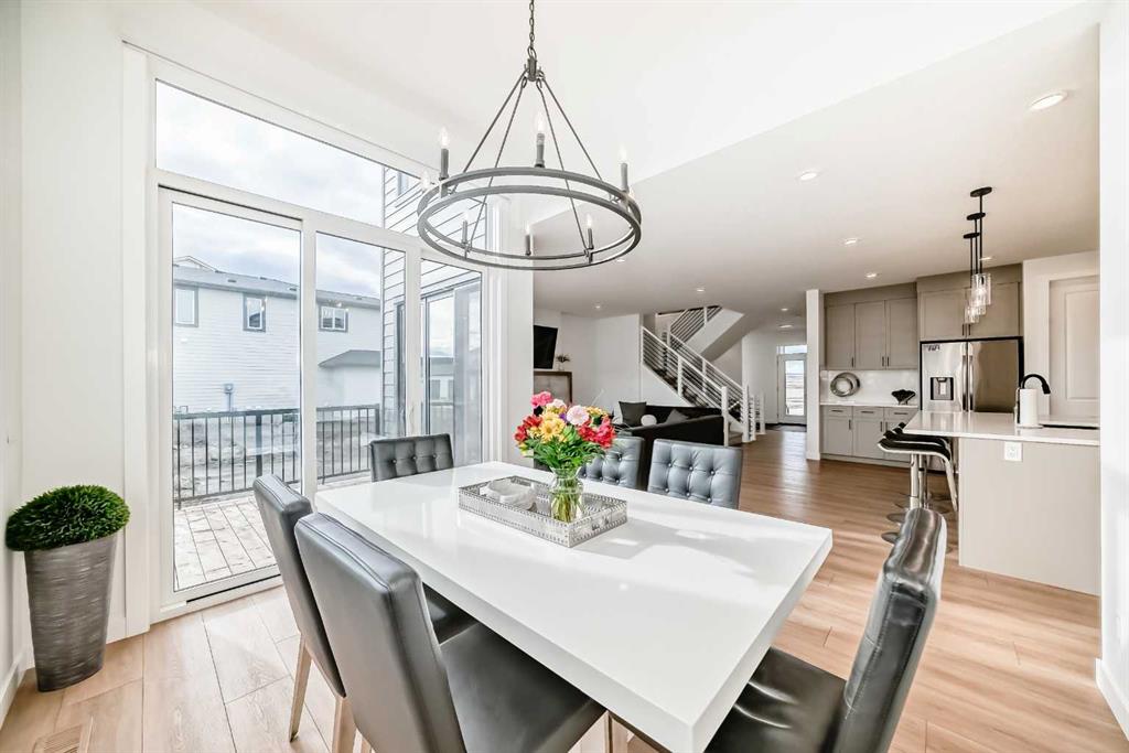 The heart of the home opens into a bright and expansive great room, anchored by a cozy gas fireplace and seamlessly connected to the kitchen and dining area—perfect for both entertaining and family life. The kitchen boasts a large island with a flush eating bar, a walk-in pantry, and modern finishes that make cooking and hosting effortless. At the rear of the home, the dining area offers backyard views and easy access to outdoor living, enhanced by the professionally finished landscaping.