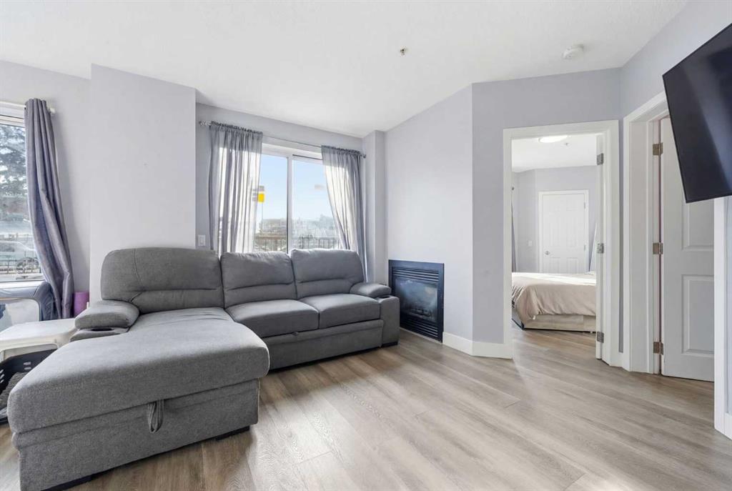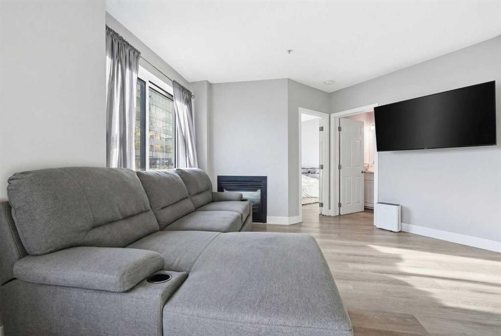 Enjoy incredible natural light all day with two south-facing living room windows, a south-facing bedroom window, and a south-facing private balcony. The open-concept layout features stylish LVP flooring, quartz countertops, stainless steel appliances, in-suite laundry, and a cozy double-sided fireplace connecting the living space and bedroom.