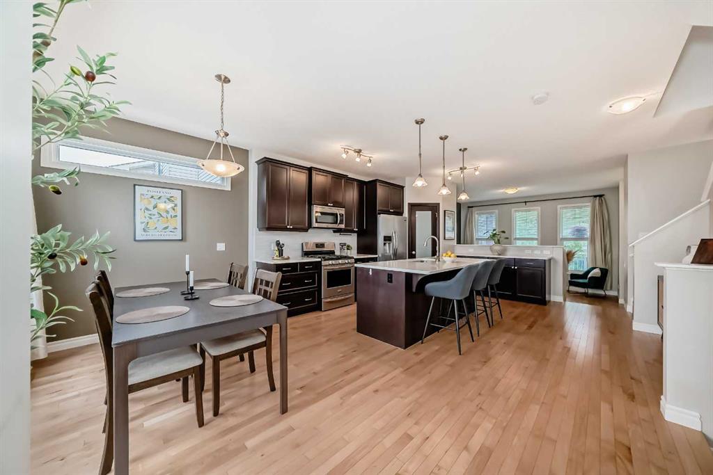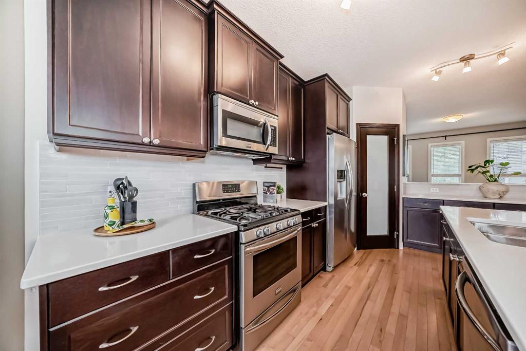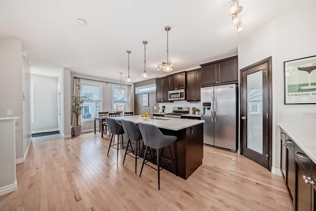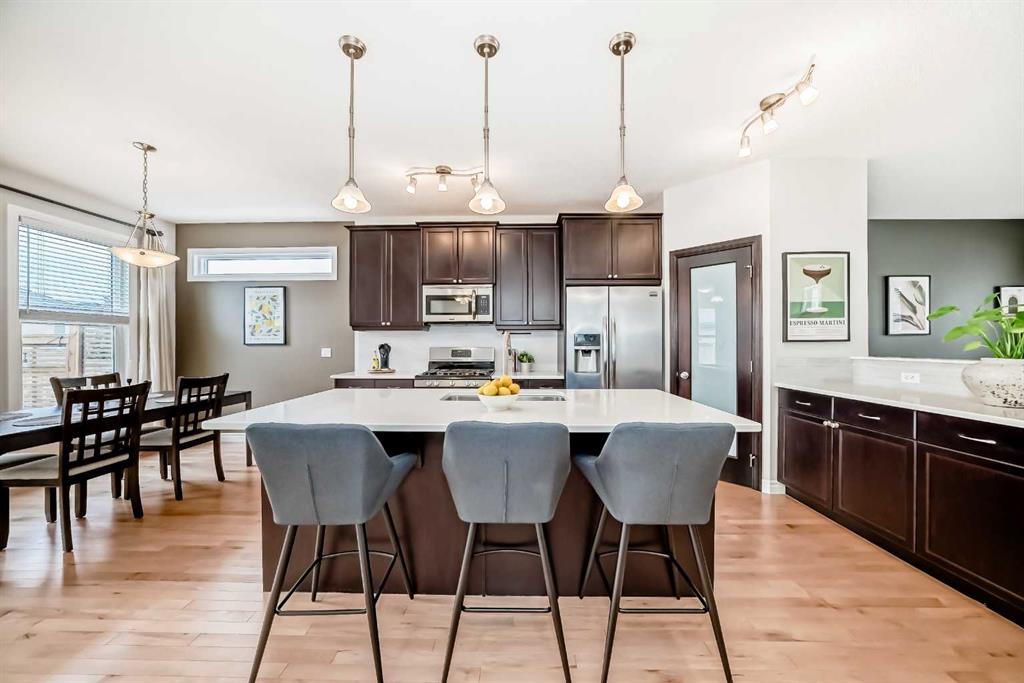 A step up, the heart of the home unfolds into a gourmet custom kitchen designed to inspire your inner chef. Thoughtfully laid out with ample cabinetry, a walk-in corner pantry, gleaming quartz countertops, a large central island, and sleek stainless steel appliances, this space is both practical and beautiful. The spacious dining area is perfect for hosting gatherings, leading you out onto the back deck to the professionally landscaped backyard oasis and oversized double detached garage, ideal for summer BBQs, evening cocktails, or peaceful moments of solitude.