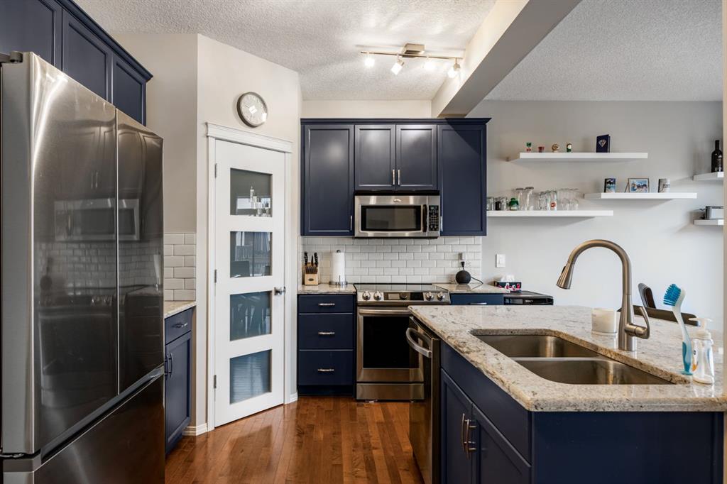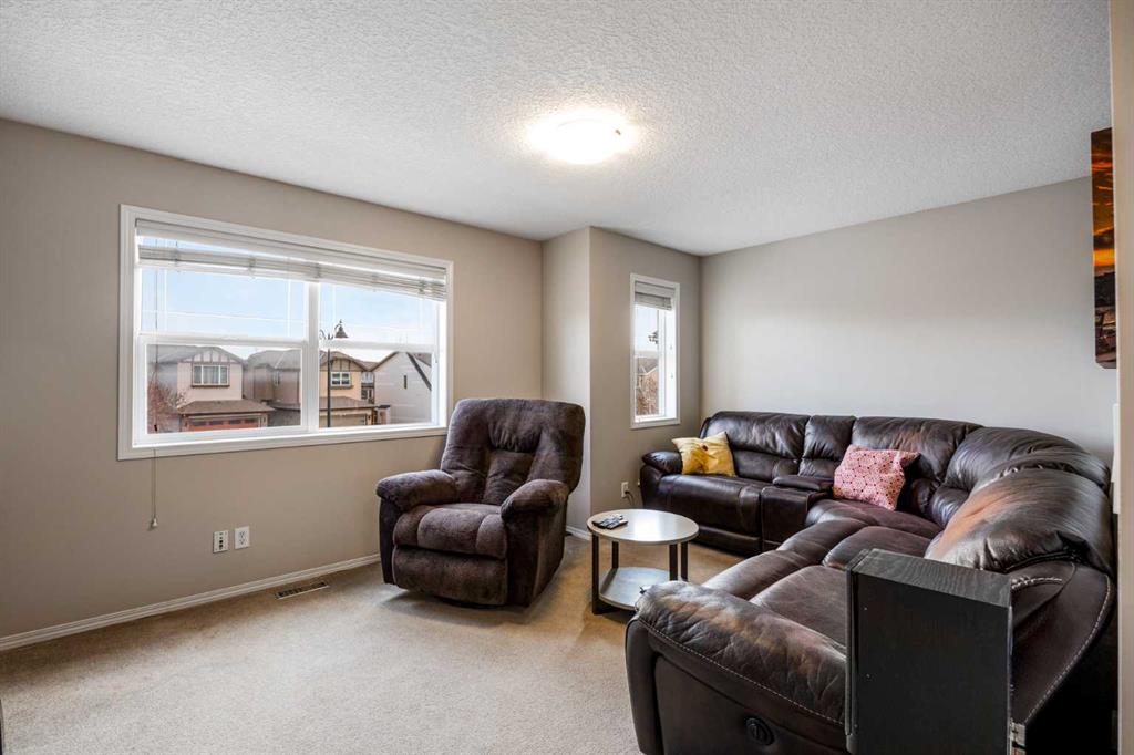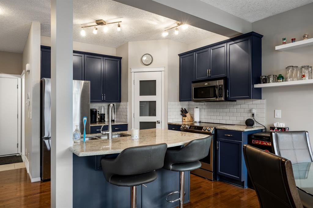 Do not miss this fantastic prospect in Calgary’s deep SE community of New Brighton. A move-in ready gem - two-storey, 2,100 sq. ft. of living space with 3 bedrooms, 3.5 baths, a front-facing, double, attached garage and tons of parking room for the family fleet. Lots of curb appeal because of the tasteful, well-maintained front and back lawns and mature bushes. The main level is open concept highlighting 9-foot ceilings and warm hardwood floors throughout. Massive windows flood the whole area in warm natural light. The living room is made even more inviting with a tiled gas fireplace. Patio doors in the dining room provide access to the deck and backyard. Sleek, modern, dark blue cabinets are featured in the kitchen along with stainless appliances, a corner pantry, granite countertops, tiled backsplash and a breakfast bar/island with deep under counter mounted double sinks. The main level is completed with a 2-pc. bath adjacent to a convenient laundry room. Up to the carpeted second floor, the primary bedroom is its own sanctuary with a 3-pc. walk through ensuite and substantial walk-in closet. Two additional bedrooms share a tiled 4-pc. bath. The finishing touch is a bonus, well-windowed room which could be utilized as a family room or home office. The lower carpeted level is fully developed with a rec room for family enjoyment, a 4-pc. bath and a utility/storage room. A gigantic south-west facing backyard is fully fenced to give you your own private outdoor retreat. A railed wooden deck allows you to expand your summer entertainment area. The yard would be a delight for gardeners and hobbyists with a green thumb. Location here is key with quick access to Deerfoot and Stoney Trails, 52nd Street SE and a Walmart Supercentre, additional shopping and restaurants on 130th Avenue SE, schools (public and Catholic), child care, playgrounds, transit, New Brighton Resident Association, New Brighton Central Park and the South Campus Health Centre. Don’t let this opportunity pass you by.