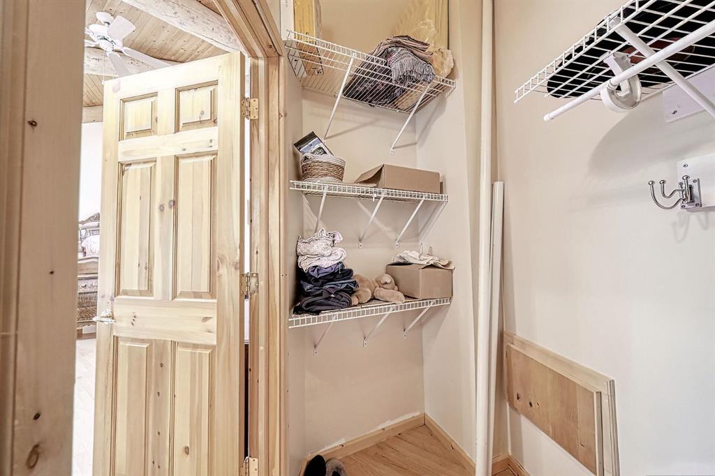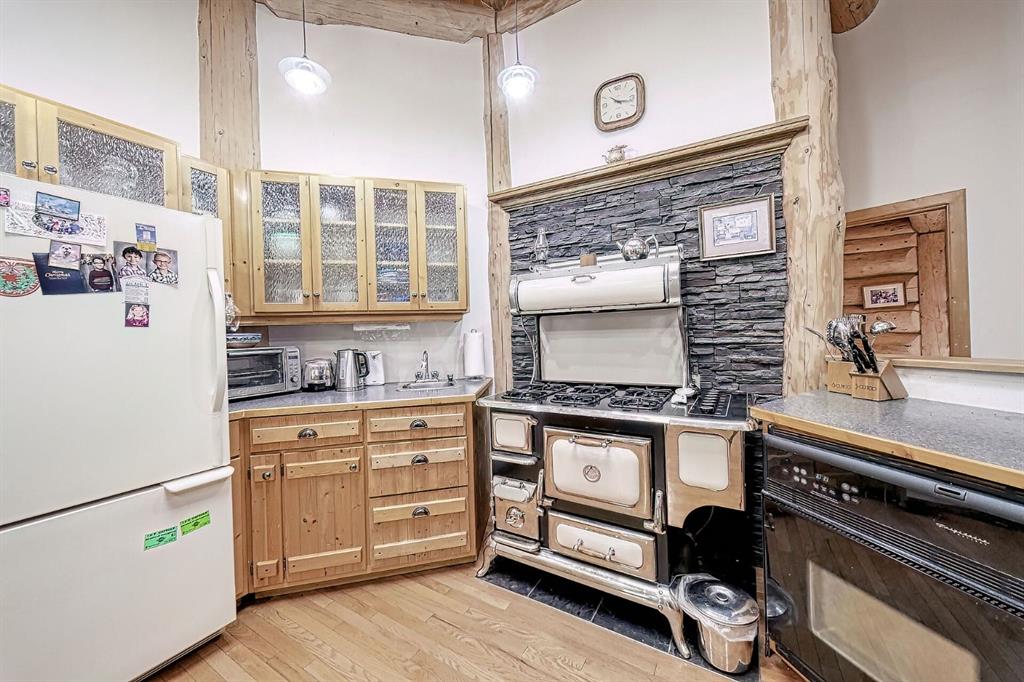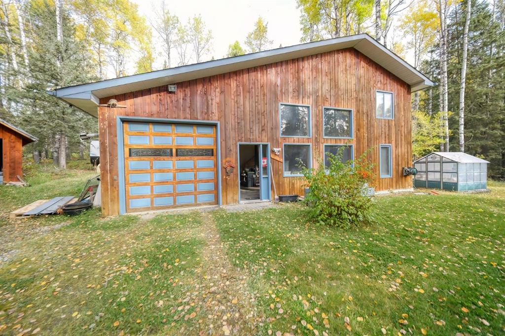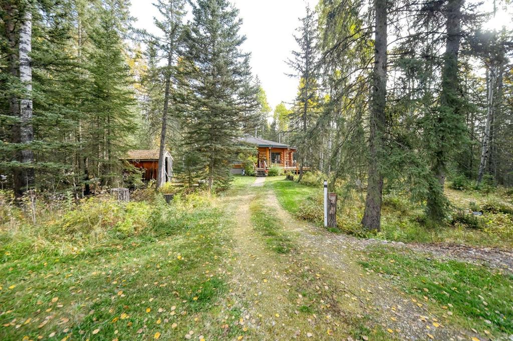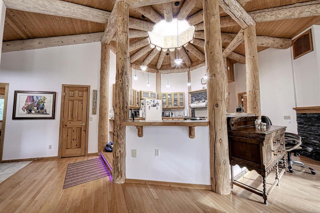 Nestled on 20 secluded treed acres near Dartique Hall, this unique circular log home offers privacy, character, and thoughtful design. The walkout bungalow features a true Heart of the Home central kitchen with an old-fashioned style gas stove, electric oven, dishwasher, fridge, and pantry overlooking bright open living and dining areas with large windows to flood the home with light. French doors in the dining area lead out to the new semi-wraparound premium composite deck perfect for entertaining or to charge your batteries and soak up the serenity. The main floor with soaring ceiling includes a tranquil primary bedroom suite with skylights, & 3pc ensuite, & walk-in closet, a second spacious bedroom, 3pc bath, laundry room w/ in-floor heat and mud room. Downstairs offers two additional bedrooms, a huge family and games area, and two storage rooms. A separate 1,056 SF Heated Workshop adds exceptional versatility for a home based business, a guest house, rental unit or space for your hobbies. Currently used as a workshop, it is comprised of a large main floor area, laundry room, 4-piece bath, mudroom, with a loft and walk-in closet upstairs plus a single unheated garage space. Additional outbuildings include shed, greenhouse and an additional single car garage. This One of a Kind home full of potential for your own personal design ideas is all surrounded by peaceful forest for a truly private retreat yet close to the Town of Cochrane and Calgary.