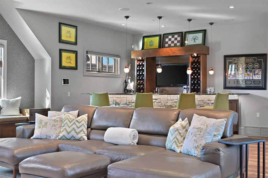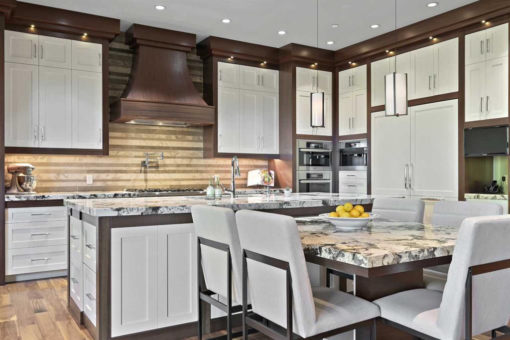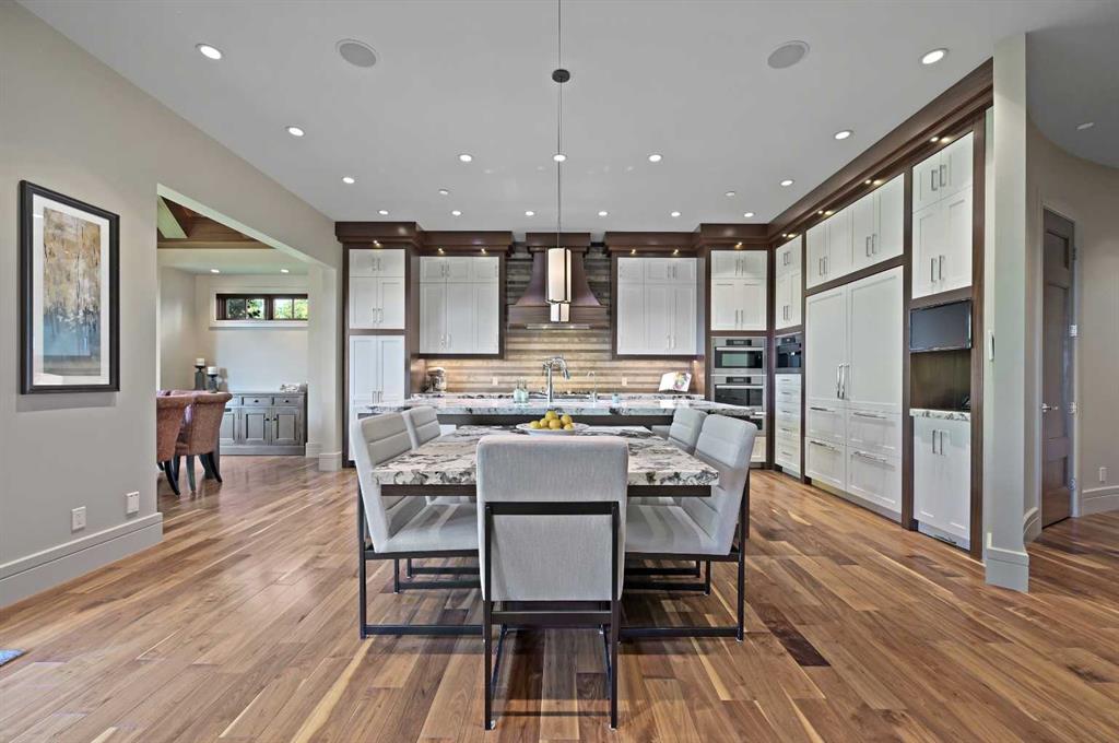 Nestled within the prestigious enclave of Springbank Valley Heights, this exceptional custom-built estate embodies understated luxury and timeless sophistication.Spanning over 7,500 square feet of exquisitely designed living space on a 12,604 sq. ft. lot, every detail of this residence reflects a deep commitment to craftsmanship and elegance.The stately stone exterior and charming front veranda create a distinguished first impression, while the grand foyer—with its sweeping curved staircase and polished hardwood floors—sets the stage for the refined interiors beyond. Designed for both culinary excellence and intimate entertaining, the gourmet kitchen features professional grade Viking and Miele appliances, including a gas range, an additional speed oven that doubles as a microwave, espresso machine, triple dishwashers, and a large double Sub-Zero fridge that complements the kitchen’s exceptional functionality.Granite countertops and custom cabinetry elevate the space, while the great room exudes warmth and sophistication, showcasing a custom granite stone fireplace that creates a “Chic Chalet” ambiance reminiscent of an upscale mountain retreat—perfect for gathering and relaxation. This space flows into the adjacent dining room, distinguished by its vaulted ceiling with custom wood inlay and uninterrupted ravine views—an inspiring setting for hosting or intimate evenings, framed by expansive windows that open to a serene west-facing backyard. Outside, an inviting new tile patio with a built-in BBQ and wood-burning fireplace creates a seamless extension of the home—ideal for alfresco dining and evening conversation as the sun sets over the ravine. A private home office with custom millwork provides a peaceful retreat for productivity, while the heated triple-car garage with its own furnace offers direct access to a spacious media lounge complete with wet bar, two-piece bath, and home theatre setup. Upstairs, the primary suite is a sanctuary of calm with a spa-inspired 6-piece ensuite featuring a steam shower, dual vanities, and a meticulously designed walk-in closet.Two additional bedrooms, each with private ensuites, are complemented by a full upper-level laundry room for convenience. A second laundry area on the main level adds thoughtful functionality.The walkout lower level caters to wellness and leisure, showcasing a training pool enclosed in glass-a space that feels like a private spa, complete with bar fridge and freezer drawers, alongside a fully equipped fitness room and two additional bedrooms, each with a full bath.Thoughtfully appointed with in-floor heating, triple furnace systems, and a comprehensive fire suppression system, this residence offers a rare combination of advanced safety, comfort, and timeless style.Privately positioned against the ravine and just minutes from Aspen Landing and Stoney Trail, this is more than a home—it is a statement of enduring quality, designed for those who appreciate refinement, privacy, and elegance in every detail.