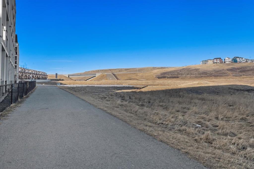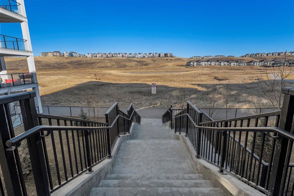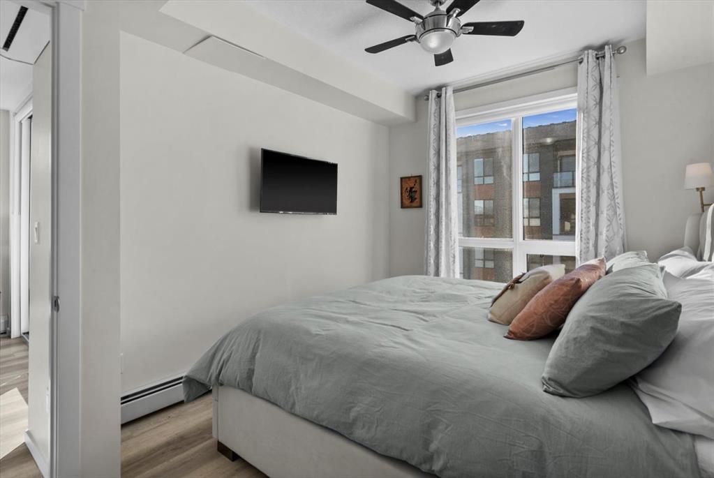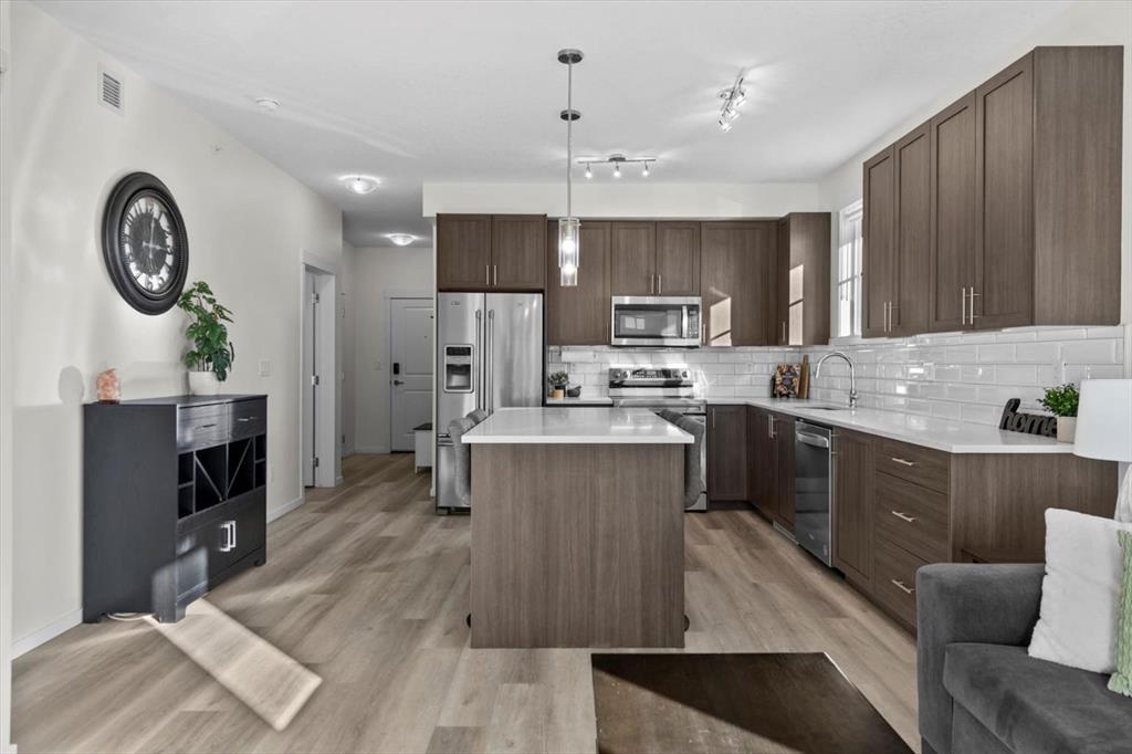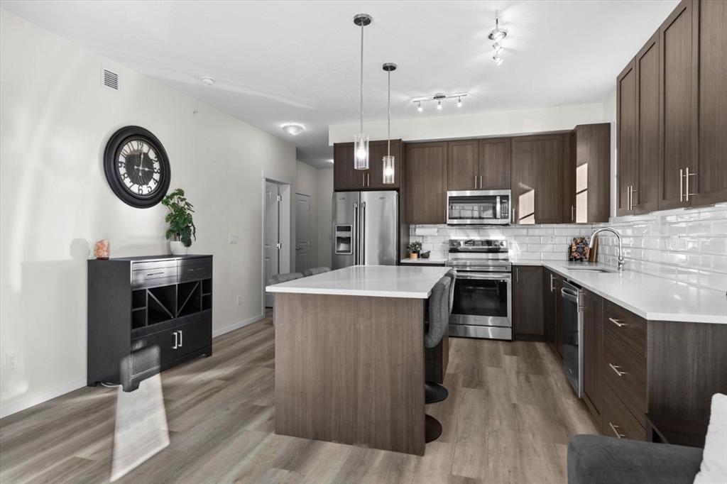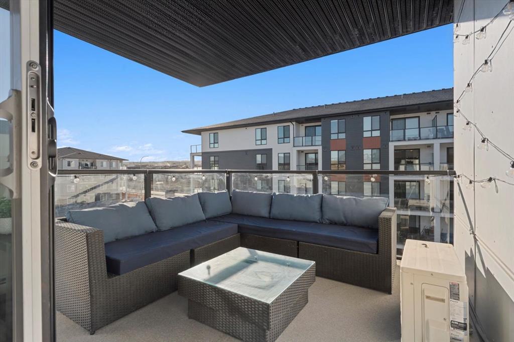 Are you looking for a bright, top floor home in a newer development with air conditioning? What about with a sunny SW covered balcony, steps to kms of pathways surrounding West Nose Creek? As a corner unit, sunlight flows through the home which is set back from the hall unlike most of the layouts in this development, and you can spend summer kicking back and BBQing in the sunshine. An original owner, this home was upgraded in several areas during initial construction. Enjoy no carpet with LVP throughout, which works well for a pet friendly place! The gorgeous kitchen is centered around the deluxe island and features stainless steel appliances, chess beveled backsplash, shaker style cabinets and 42-inch uppers, plus the 9 ft ceilings and over sink window assist to make this kitchen feel even larger. With upgraded quartz throughout the kitchen and bathrooms, also find additional drawers and built ins throughout. The large primary suite can accommodate a king sized bed with a customized walk-in closet that leads through to the ensuite. Here, the glass paneled shower also highlights the upgraded plumbing throughout. The second bedroom is across from the 4 piece bathroom, making this layout great for guests or even a roommate if so desired. The in suite laundry has been installed to maximize space in the storage room, and additional shelving with another electrical plug were added to ensure this was a great combination space your cleaning supplies and whichever cordless vacuum you chose to install. The titled parking spot is in the underground parkade and is close proximity to the assigned storage locker. This home is quick access to both Stoney Trail and 144th via Symons Valley, and the number of shops and amenities now in the Sage Valley area make this offering even sweeter. Will you spend your Saturday cruising out to the Rocky Mountains, or to shop in the Shoppes at Sage Hill? Contact your trusted advisor for a private showing and get in before She Gon’!