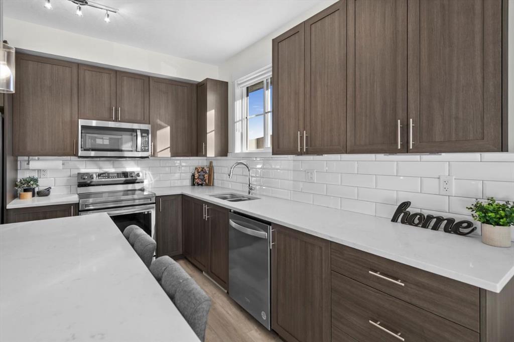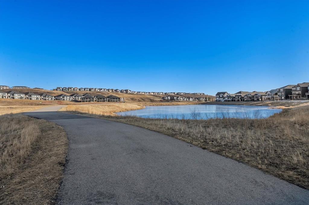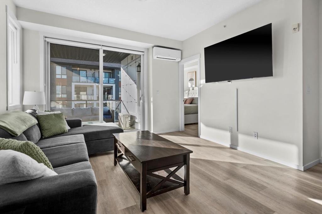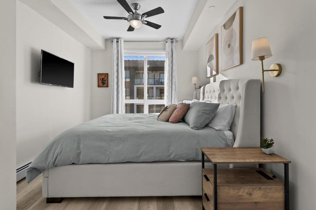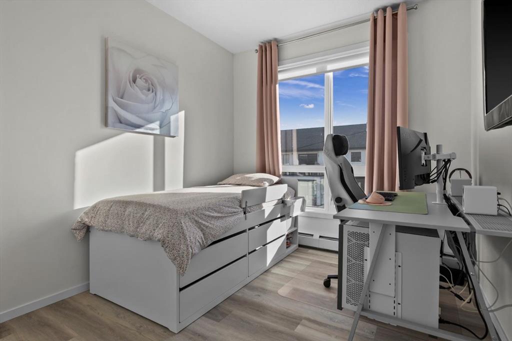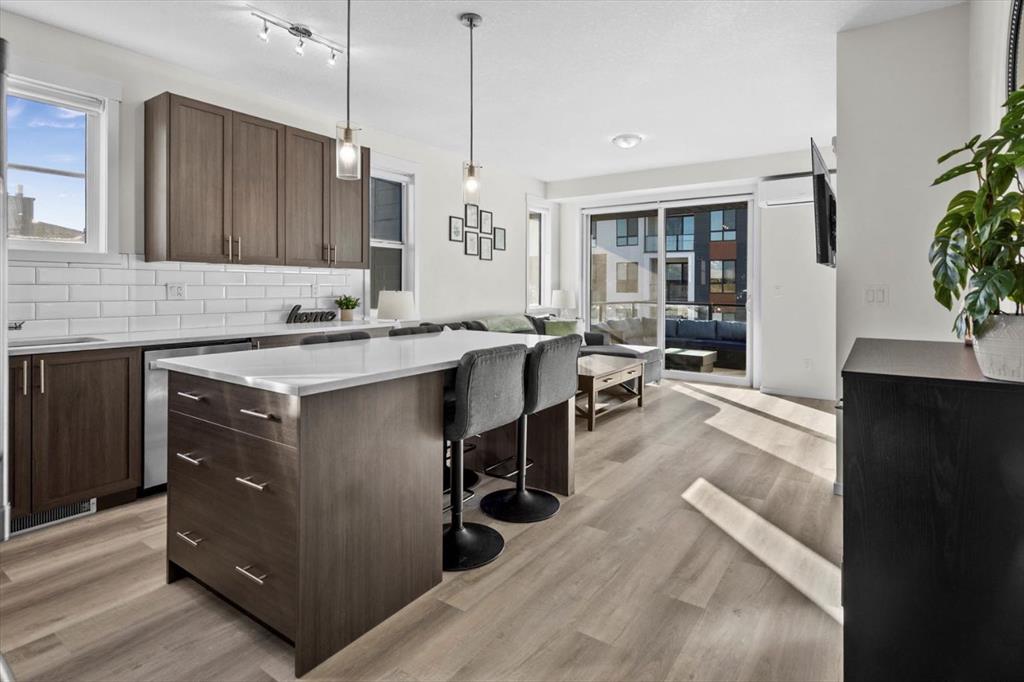 Are you looking for a bright, top floor home in a newer development with air conditioning? What about with a sunny SW covered balcony, steps to kms of pathways surrounding West Nose Creek? As a corner unit, sunlight flows through the home which is set back from the hall unlike most of the layouts in this development, and you can spend summer kicking back and BBQing in the sunshine. An original owner, this home was upgraded in several areas during initial construction. Enjoy no carpet with LVP throughout, which works well for a pet friendly place! The gorgeous kitchen is centered around the deluxe island and features stainless steel appliances, chess beveled backsplash, shaker style cabinets and 42-inch uppers, plus the 9 ft ceilings and over sink window assist to make this kitchen feel even larger. With upgraded quartz throughout the kitchen and bathrooms, also find additional drawers and built ins throughout. The large primary suite can accommodate a king sized bed with a customized walk-in closet that leads through to the ensuite. Here, the glass paneled shower also highlights the upgraded plumbing throughout. The second bedroom is across from the 4 piece bathroom, making this layout great for guests or even a roommate if so desired. The in suite laundry has been installed to maximize space in the storage room, and additional shelving with another electrical plug were added to ensure this was a great combination space your cleaning supplies and whichever cordless vacuum you chose to install. The titled parking spot is in the underground parkade and is close proximity to the assigned storage locker. This home is quick access to both Stoney Trail and 144th via Symons Valley, and the number of shops and amenities now in the Sage Valley area make this offering even sweeter. Will you spend your Saturday cruising out to the Rocky Mountains, or to shop in the Shoppes at Sage Hill? Contact your trusted advisor for a private showing and get in before She Gon’!