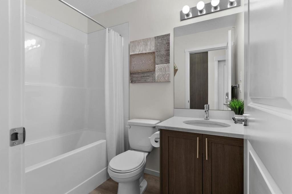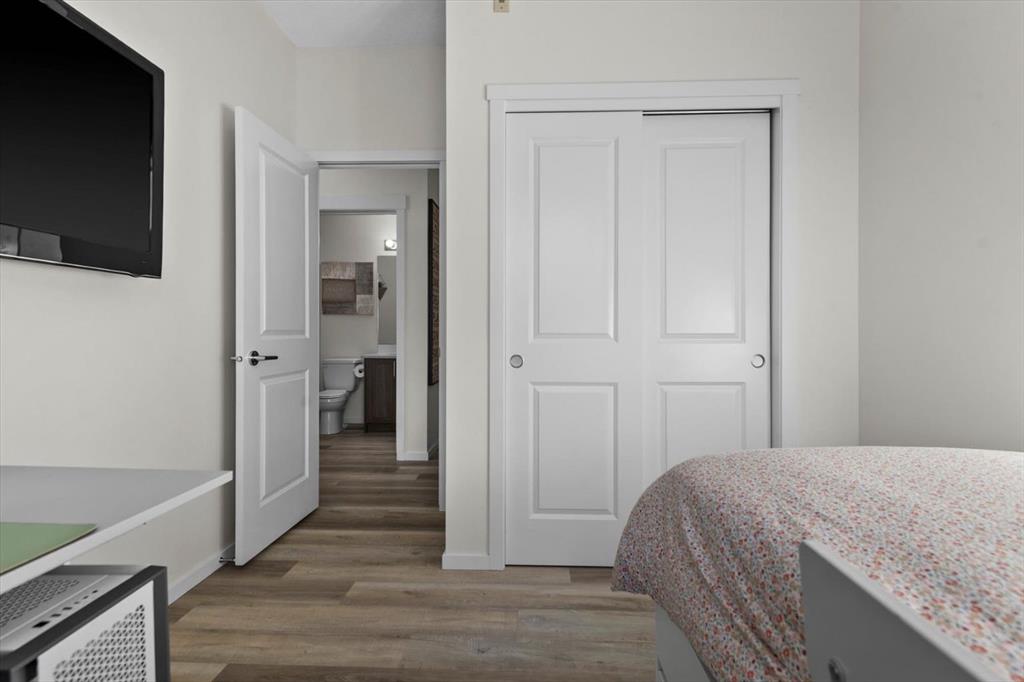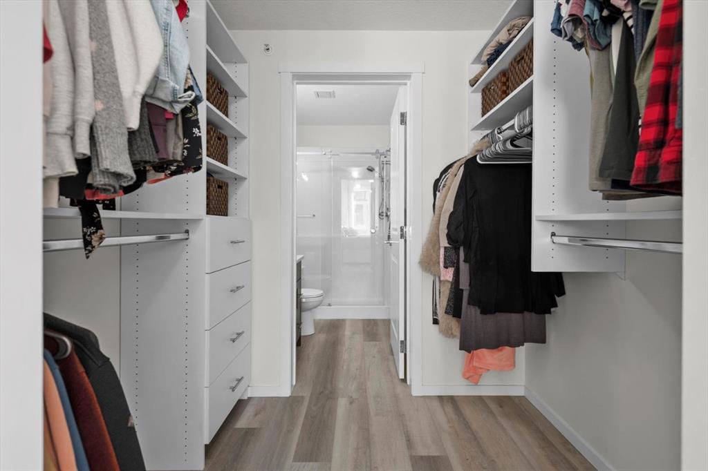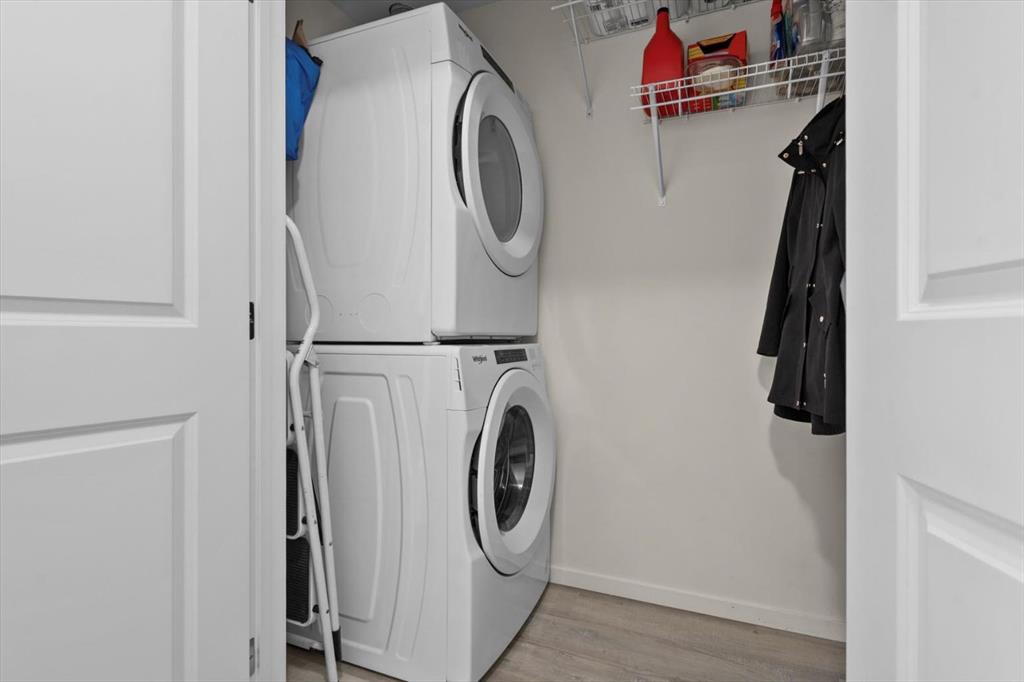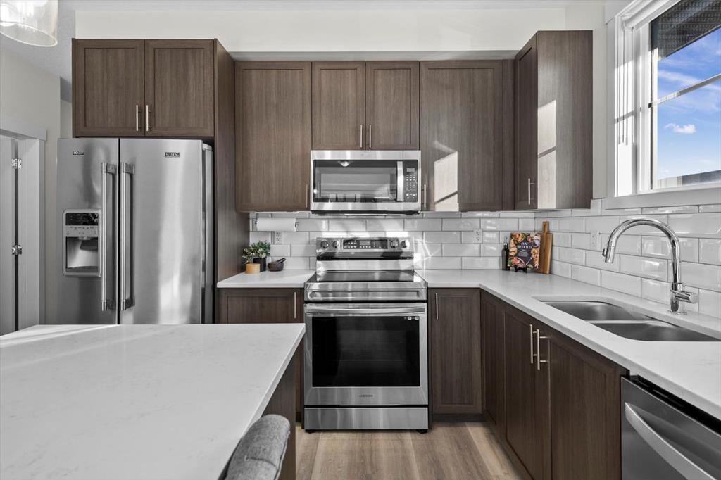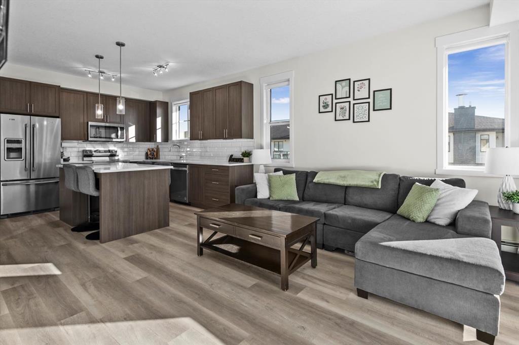 Are you looking for a bright, top floor home in a newer development with air conditioning? What about with a sunny SW covered balcony, steps to kms of pathways surrounding West Nose Creek? As a corner unit, sunlight flows through the home which is set back from the hall unlike most of the layouts in this development, and you can spend summer kicking back and BBQing in the sunshine. An original owner, this home was upgraded in several areas during initial construction. Enjoy no carpet with LVP throughout, which works well for a pet friendly place! The gorgeous kitchen is centered around the deluxe island and features stainless steel appliances, chess beveled backsplash, shaker style cabinets and 42-inch uppers, plus the 9 ft ceilings and over sink window assist to make this kitchen feel even larger. With upgraded quartz throughout the kitchen and bathrooms, also find additional drawers and built ins throughout. The large primary suite can accommodate a king sized bed with a customized walk-in closet that leads through to the ensuite. Here, the glass paneled shower also highlights the upgraded plumbing throughout. The second bedroom is across from the 4 piece bathroom, making this layout great for guests or even a roommate if so desired. The in suite laundry has been installed to maximize space in the storage room, and additional shelving with another electrical plug were added to ensure this was a great combination space your cleaning supplies and whichever cordless vacuum you chose to install. The titled parking spot is in the underground parkade and is close proximity to the assigned storage locker. This home is quick access to both Stoney Trail and 144th via Symons Valley, and the number of shops and amenities now in the Sage Valley area make this offering even sweeter. Will you spend your Saturday cruising out to the Rocky Mountains, or to shop in the Shoppes at Sage Hill? Contact your trusted advisor for a private showing and get in before She Gon’!