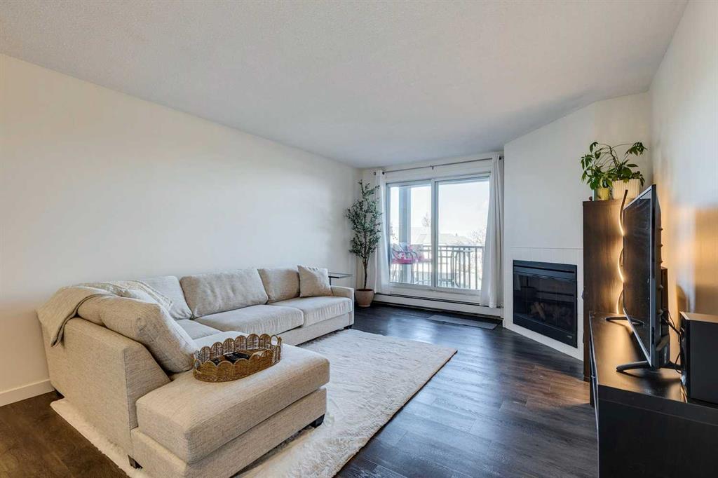 The unit features open living and dining space with large windows that look toward the city skyline. The primary bedroom is generously sized and can comfortably fit larger furniture. The living room features a natural gas fireplace and opens onto a private balcony with an exterior storage room for seasonal items. The kitchen has been refreshed with updated cabinetry, backsplash, quartz counters, and newer appliances, providing a clean and functional workspace. Additional storage is available in the lower level of the building. One assigned parking stall is located close to the entrance, with the option to arrange a second leased stall if required. The complex is surrounded by mature trees and nearby pathways for walking and biking. An affordable option for first time buyers, students, investors, or anyone looking for straightforward condo living in an established neighborhood.