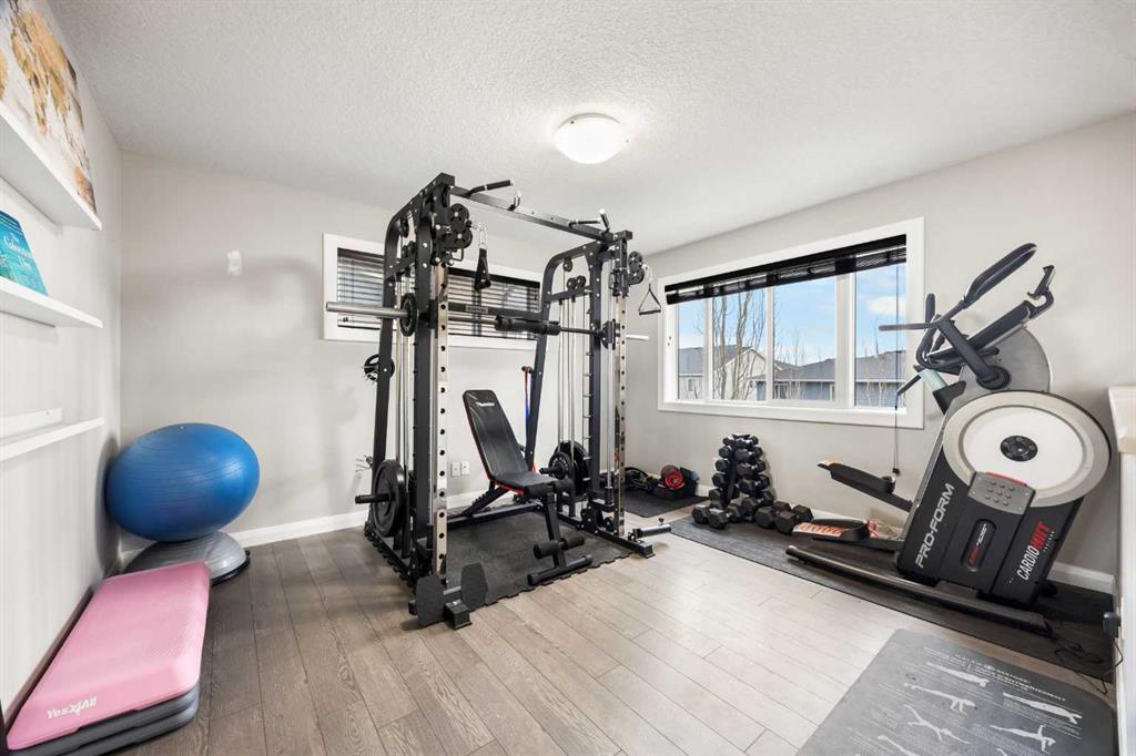 The upper level includes a Bonus room currently used as a gym ( gym equipments can be included with good offer ) , plus three bedrooms including the spacious Primary bedroom with box up ceiling, walk-in closet and a spa-inspired ensuite featuring a soaker tub, tiled shower, and dual vanities. Going down one level from the main floor, you’ll discover another comfortable Living room along with a flex room, currently used as a personal massage room. This space can easily be converted into a private home office or hobby room to suit your lifestyle.
