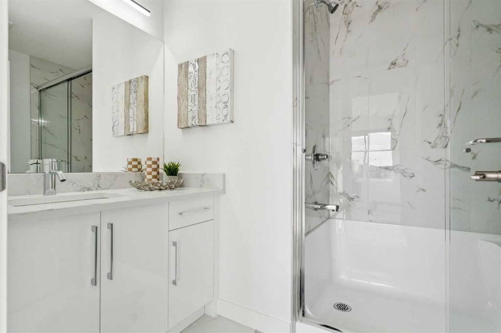 NO CONDO FEES UNTIL 2028 | IMMEDIATE POSSESSION | 5 BEDROOM END UNIT | MAIN-FLOOR PRIVATE GUEST SUITE | TOTAL 1,984 SQ FT | Welcome to Unit 201 at Saddlecrest Living, a 5-bedroom, 4-full bath end unit townhome located in a brand-new 43-unit community in Calgary’s Northeast. This home is spread across three levels with an attached garage, offering both space and flexibility for families. A standout feature is the main-floor private guest suite with a full bathroom and separate rear entry, ideal for extended family, guests, or future rental income potential. The main living area features an open-concept layout with 9-foot ceilings and triple-pane windows that bring in natural light while improving energy efficiency. The kitchen is finished with floor-to-ceiling cabinetry and premium quartz countertops, and stainless steel appliances, creating a clean and modern look. Upstairs, the primary bedroom includes a custom shower with a built-in seat, while all bathrooms feature full-height tile for a contemporary finish. Carpeted bedrooms add comfort, and luxury vinyl plank flooring on the main level ensures durability and easy maintenance. Built for Calgary’s climate, the exterior combines stucco and Hardie siding for hail protection and low maintenance. Saddlecrest Living is a connected, family-friendly community close to schools, playgrounds, Saddletowne LRT, shopping, medical clinics, and fitness centres, with quick access to Stoney Trail, Calgary International Airport, Costco, CrossIron Mills, and New Horizon Mall. Whether this is your first home, a step up for a growing family, or a smart investment, Unit 201 offers space, versatility, and long-term value in one of Calgary’s fastest-growing corridors. Visit the neighbouring showhome for a full tour of the layout and finishes. Units in this building (#201-#203) are available for purchase individually or as a full package. Images are of a similar unit in the same project and are for illustrative purposes only.