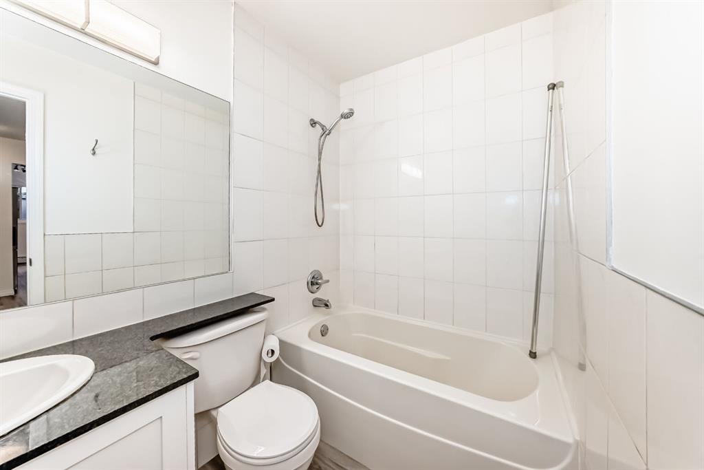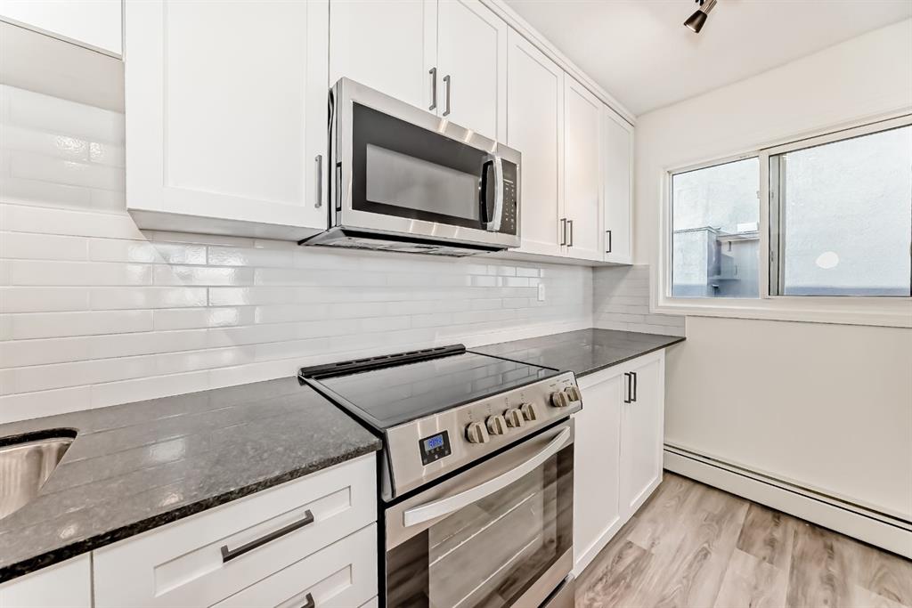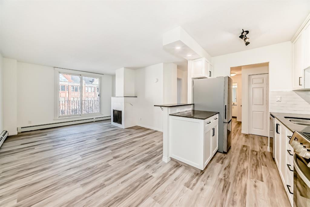 Presenting a turn-key opportunity at Larch Manor: a top-floor residence that has been updated to offer immediate comfort and sophisticated urban living. Upon entry, you are welcomed by fresh paint and brand new luxury vinyl plank flooring that flows seamlessly throughout the open concept layout. The recently renovated kitchen is both functional and refined, featuring full-height cabinetry, gleaming granite countertops, and a suite of brand new stainless-steel appliances highlighted by an induction convection stove. The adjacent living room is generously proportioned and opens onto a private patio where you can enjoy picturesque views of the Calgary Tower and downtown skyline. The home offers two spacious bedrooms, a well-appointed 4-piece bathroom, and the added convenience of a large storage room that discreetly houses a European combination washer and dryer. Beyond the interior, this home boasts one of the most desirable parking stalls in the complex—fully covered and positioned directly at the back entry for unparalleled ease of access. Situated just two blocks from the heart of 17th Avenue, Larch Manor places you moments from Calgary’s finest boutiques, dining, and lifestyle amenities, all while maintaining an impressive walkability score and effortless connectivity to the rest of the city. Ideal for the discerning first-time buyer or anyone seeking a truly move-in ready home, this property is a rare find. Contact your favourite agent to schedule your private viewing.