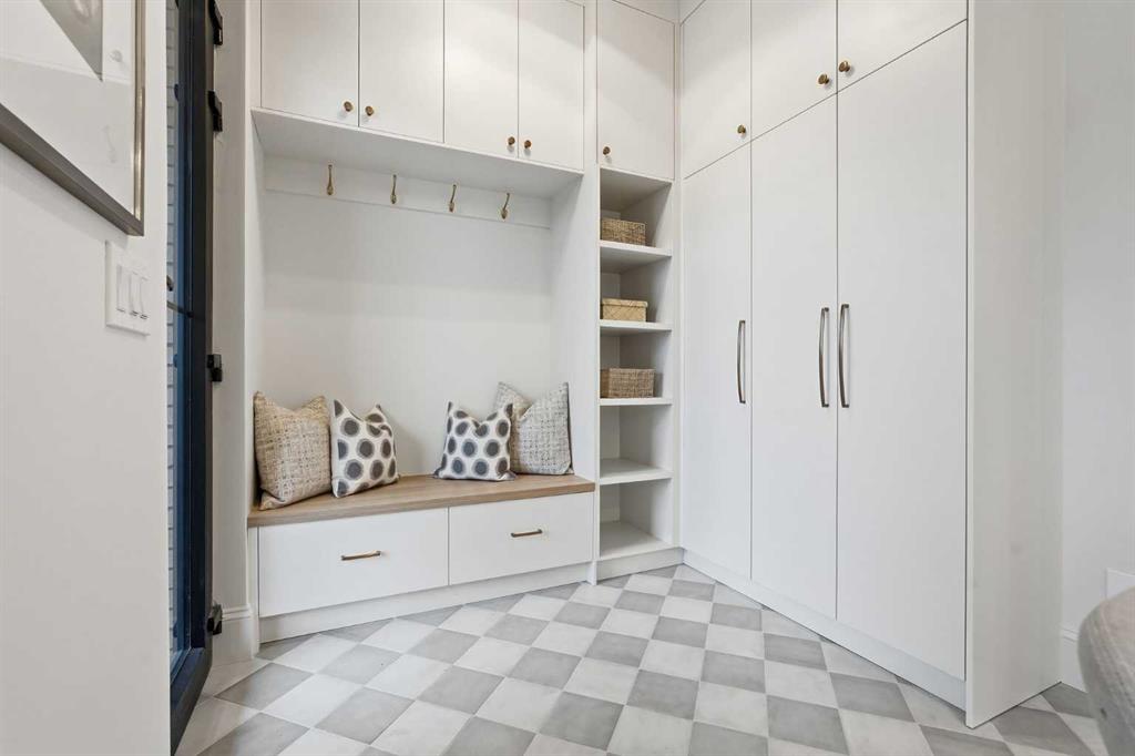 At the heart of the home, the chef’s kitchen is a true masterpiece. It features a 14-foot island with quartz from Hanstone (made in Canada), a quartz backsplash, plaster textured hood fan, pot filler, and oversized premium appliances including a 48” dual oven gas range and a 66” built-in fridge/freezer. There is a butler’s pantry with sink and cabinetry, mud room, coffee bar, and tons of storage including under the island. The kitchen is set up to be not only beautiful but also functional and includes a garbage drawer, bar cooler, and spice racks/cabinetry.