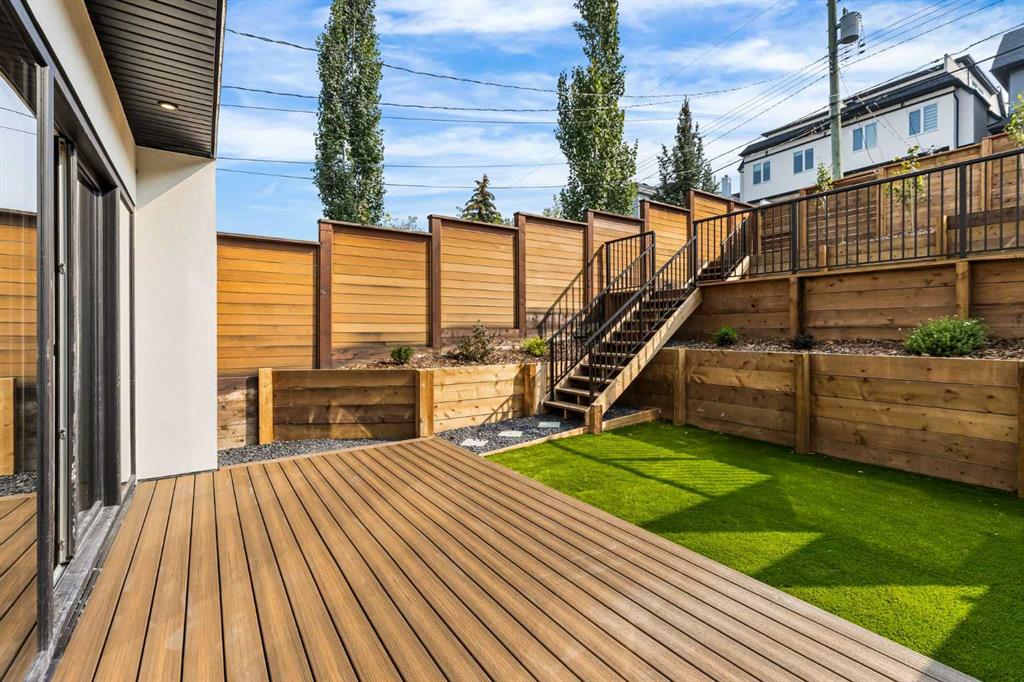 Across from it, the living room centers around a beautiful fireplace and custom built-ins which make it cozy, refined, and made for real living. Large doors lead to the deck and the sunny south facing backyard, that is tiered, turfed and truly low maintenance.