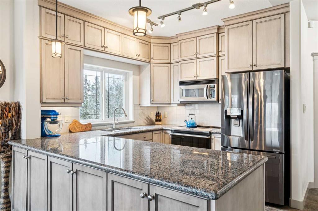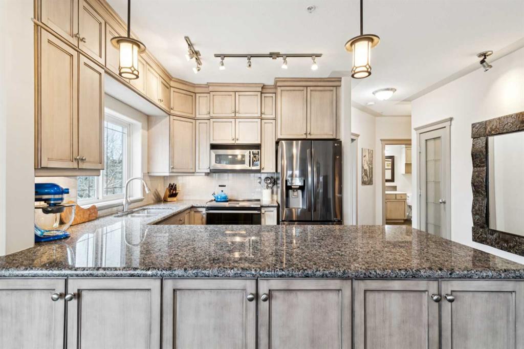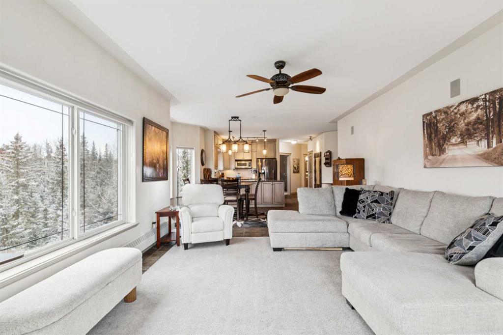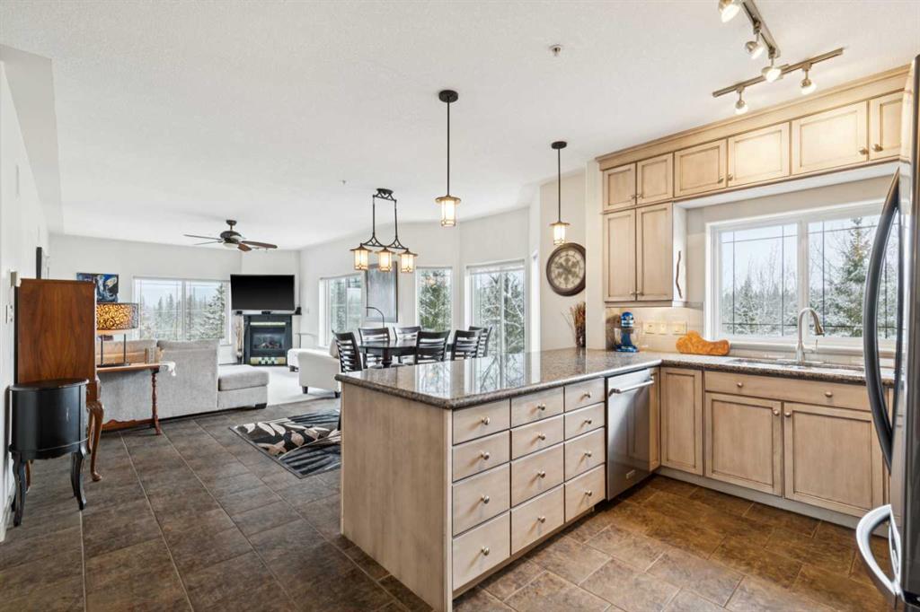 Rarely does a condo this spectacular ever become available for purchase. This expansive corner unit perched on the 4th floor boasts incredible views of Griffith Woods, the river and nature, with abundant natural light & warmth, just above the treetop elevation. Every single room offers something unique and special, simply unmatched by any other unit. With 9ft ceilings, walls of windows, total privacy and high end, updated appliances and design, this 1372 SqFt condo offers the best of condo living, in the best location. A generous foyer greets you with double closet and flows down the hallway with feature built in shelving. Convenient, spacious laundry room is on one side, along with the central 3pc bathroom. A spacious bedroom overlooks the trees with enough space for various layouts. The beautiful kitchen features full height cabinets & back splash, undermount lighting, pendant lighting, quartz countertops and high end s/s appliances including a newer induction cooktop range. There is also a dedicated pantry and under counter storage for optimal convenience. The main kitchen, dining and living rooms blend together while overlooking the serenity and beauty of nature, with blue jays, owls, wildlife and the winding river below. Enjoy the views in total privacy with a cozy corner fireplace or the covered balcony where every day feels like you are living in a mountain resort dream. The primary bedroom overlooks the river, features a generous walk through closet and large 4pc ensuite. An additional assigned storage is located with the excellent titled parking space right near the elevator. There are incredible walking paths, tennis/pickle ball courts and a fitness facility in the complex. Well managed and offered in absolutely pristine condition. This is a special condo for the most discerning buyer. The views, layout and move-in ready condition will take your breath away. Welcome home!