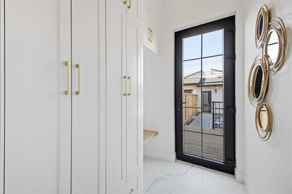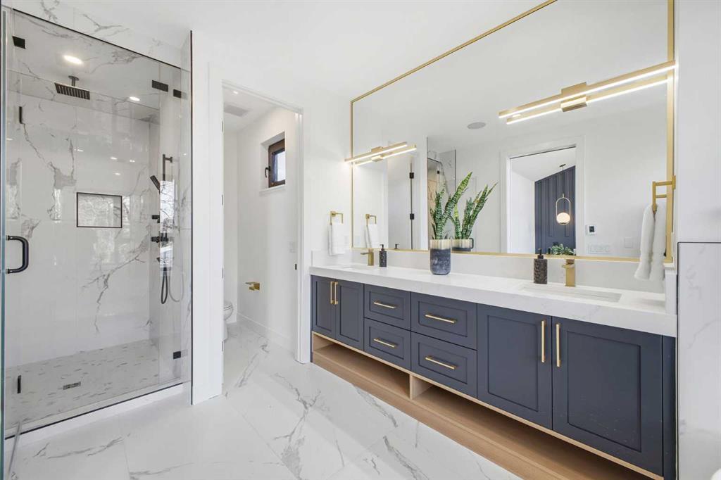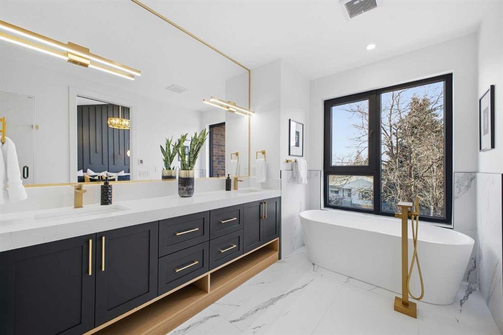 Upstairs, you'll find 9-foot ceilings throughout, an expansive primary bedroom with large windows and 13.5 foot vaulted ceilings, a walk-in closet with custom built-ins, and a luxurious 5-piece ensuite with in-floor heating, dual sinks, quartz counters, freestanding soaker tub, and a tiled glass shower. Two additional bedrooms offer generous space and light, while the main bathroom includes double sinks and full-height tile tub surround. The upper floor also features a spacious laundry room with built-in cabinetry and a linen closet.