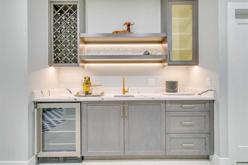 The professionally finished basement is designed for entertaining, featuring a striking custom bar with black-and-gold detailing, a wine display wall, spacious recreation room, full bathroom, and additional storage.
