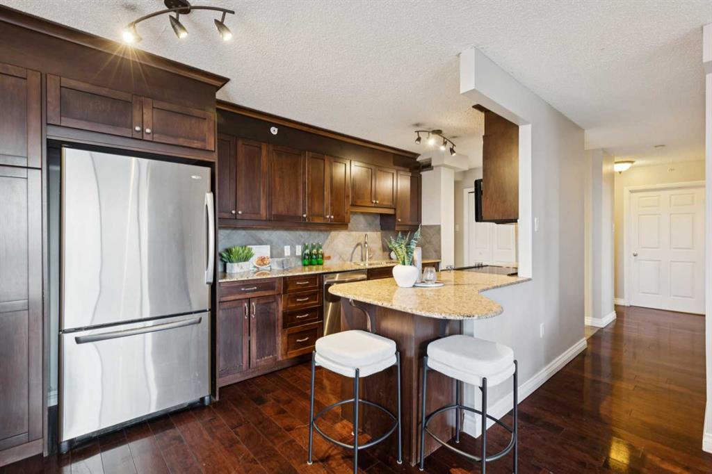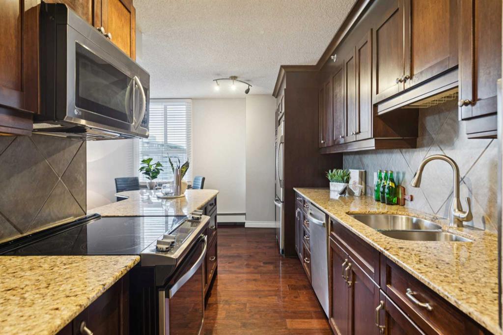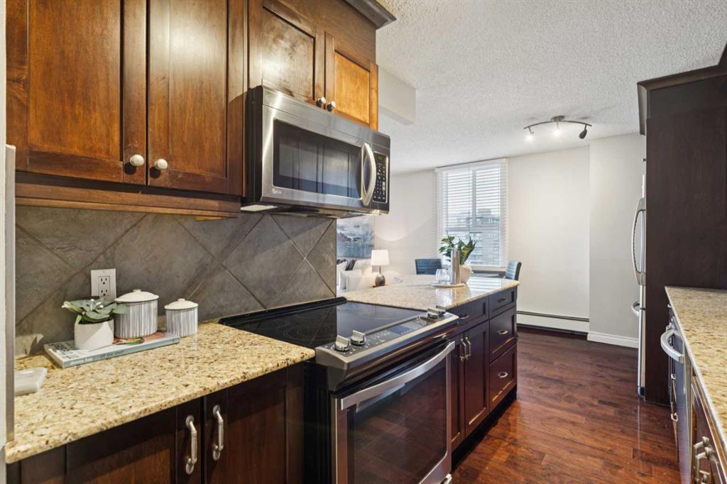 Welcome to Grosvenor House, a concrete building right in the vibrant core of downtown Calgary's Beltline neighbourhood. This south-facing 2-bedroom, 1-bath corner unit offers the perfect blend of convenience, natural light, and urban living without the premium price tag. Step inside to an open and functional layout. The living and dining areas flow nicely together, with plenty of room for your furniture setup and everyday life. The south and west-facing windows allow sunshine to flood the space all day long. The kitchen is practical and ready for use, with solid cabinetry, decent counter space, and stainless-steel appliances. It's set up for easy meal prep, whether you're cooking for one or hosting friends. Both bedrooms are generously sized and conveniently located next to the in-suite laundry and 4-piece bathroom. You’ll love the titled underground parking, which is just steps from the elevator. This is a solid, move-in-ready opportunity for first-time buyers, downsizers, or investors looking for a hassle-free rental in one of the city's most desirable walkable areas. Condo fees cover heat, water, and building maintenance, keeping your costs predictable. Location-wise, you're steps from 17th Avenue's restaurants, bars, shops, and coffee spots, with easy access to the CTrain, gyms, parks, and downtown offices. Everything Calgary's inner city has to offer is right outside your door. Call your favoriate realtor today, it's a move you'll be glad you made!