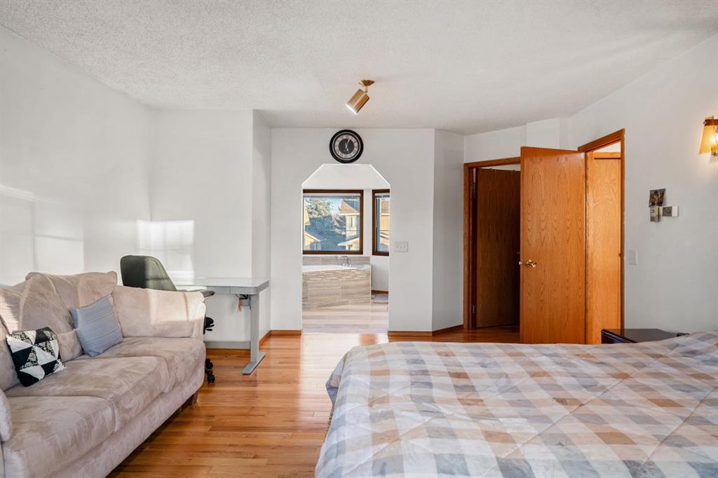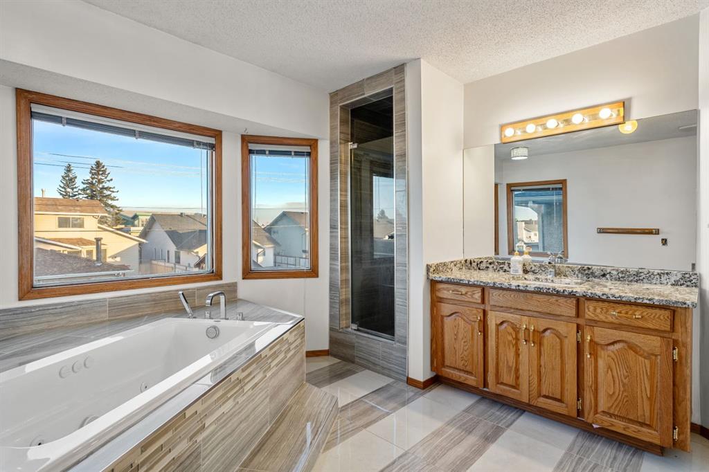 Upstairs, the spacious primary retreat offers a renovated ensuite complete with a large soaker tub, separate tiled shower, and updated vanity with stone countertop. Additional bedrooms are well proportioned, offering flexibility for family living or home office space.