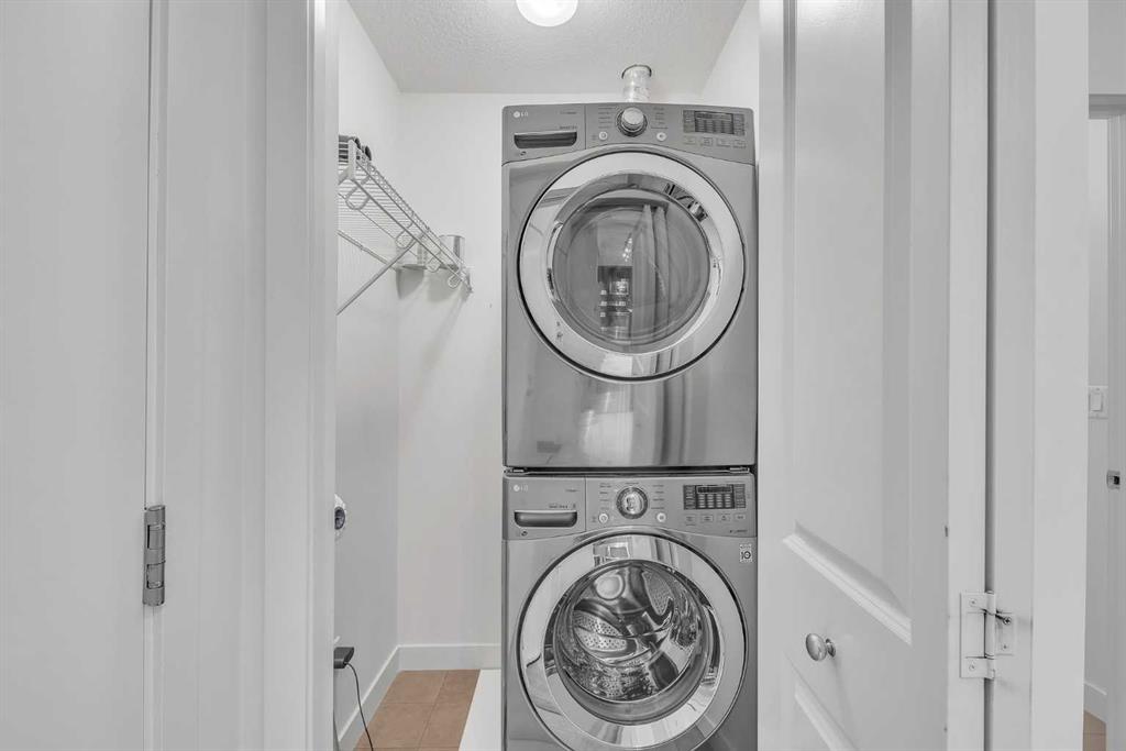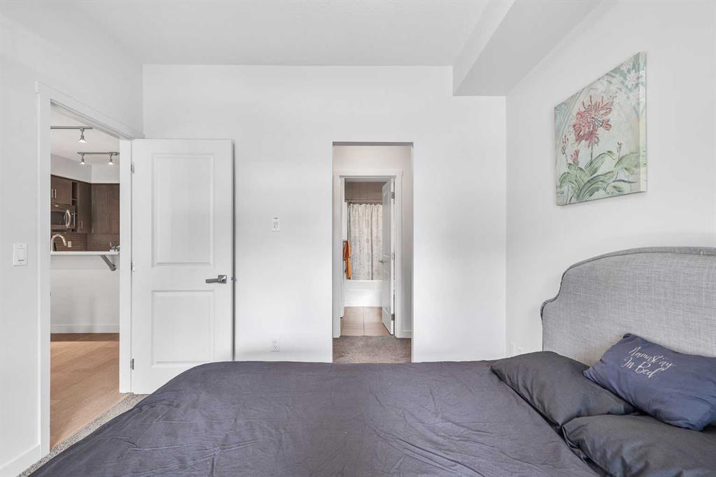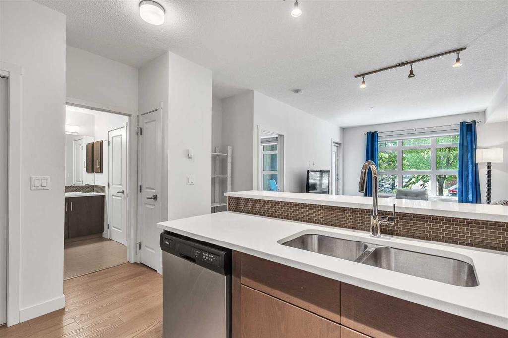 This beautifully appointed 1-bedroom, 1-bathroom west-facing condominium offers exceptional value at an affordable price. Boasting a spacious kitchen complete with soft close drawers, quartz countertops, s/s appliances, and breakfast bar. The great-sized bedroom provides ample space for rest and relaxation, with a walk-through closet and cheater door to the bathroom. The main living space offers gorgeous hardwood floors, newly added air conditioning, upgraded blinds package, big windows for plenty of natural light and large dining and living rooms. There is a covered patio off the living room with BBQ gas line and west exposure for afternoon/evening sun. A titled undergound parking stall is included and there is a storage locker for your extra gear. This home is ideally situated close to the lake and has easy access to public transportation, as well as major roadways such as Deerfoot and Stoney, making commuting a breeze. Nearby shopping, dining, and entertainment options abound, making this the perfect home for first-time buyers, investors, or downsizers looking for a comfortable and convenient lifestyle. Call today to arrange your showing!