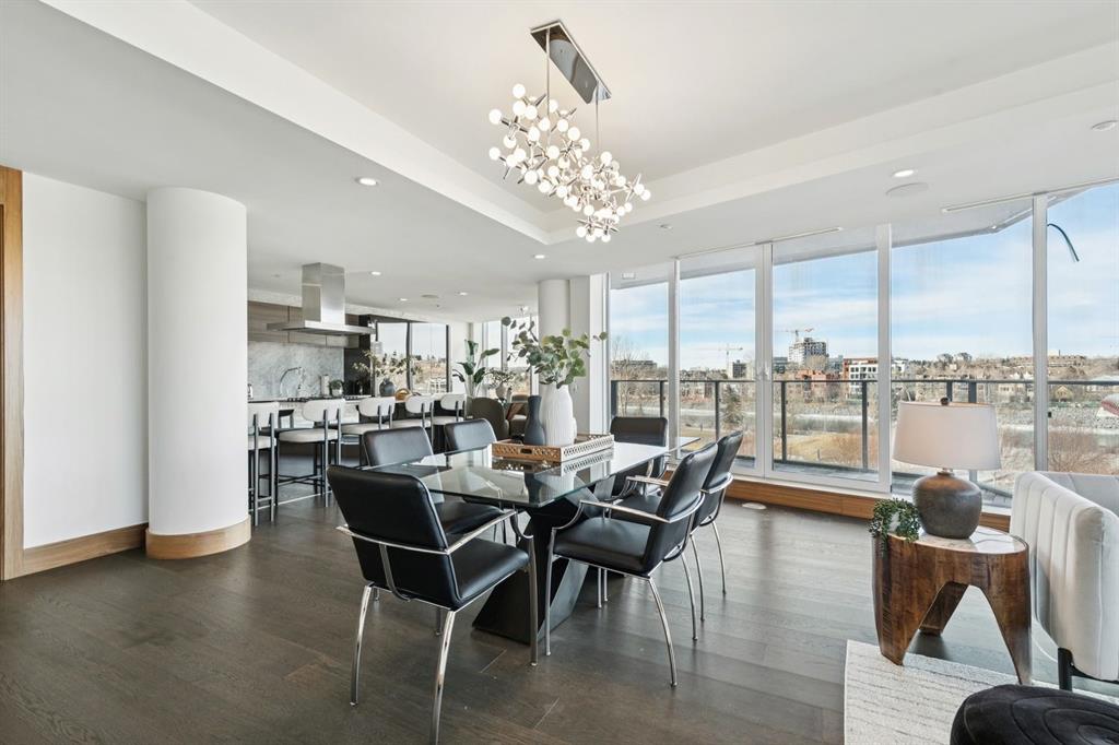 The formal dining room, adorned with a stunning chandelier, seamlessly flows into the expansive living room, which includes access to two private balconies—perfect for morning coffee or evening cocktails—while a cozy gas fireplace adds warmth.