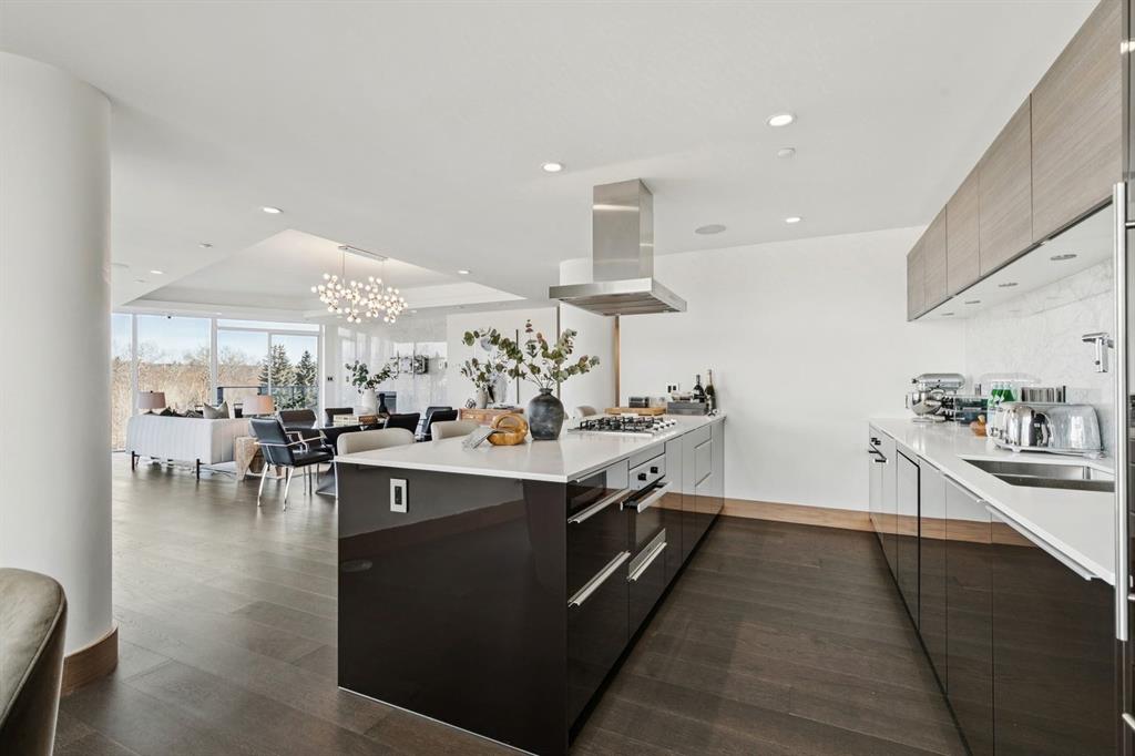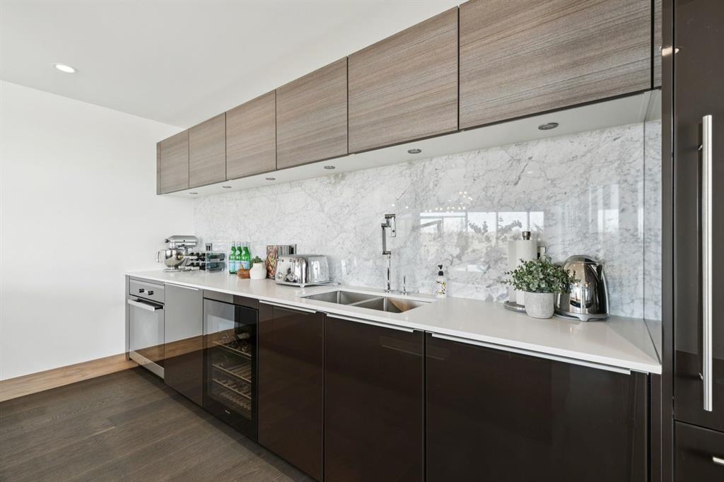 At the heart of this luxurious residence lies the Poggenpohl kitchen, equipped with white stone countertops, a spacious island that seats four, and top-of-the-line Miele appliances, including a gas cooktop, built-in refrigerator, and wine fridge—ideal for both cooking & entertaining.