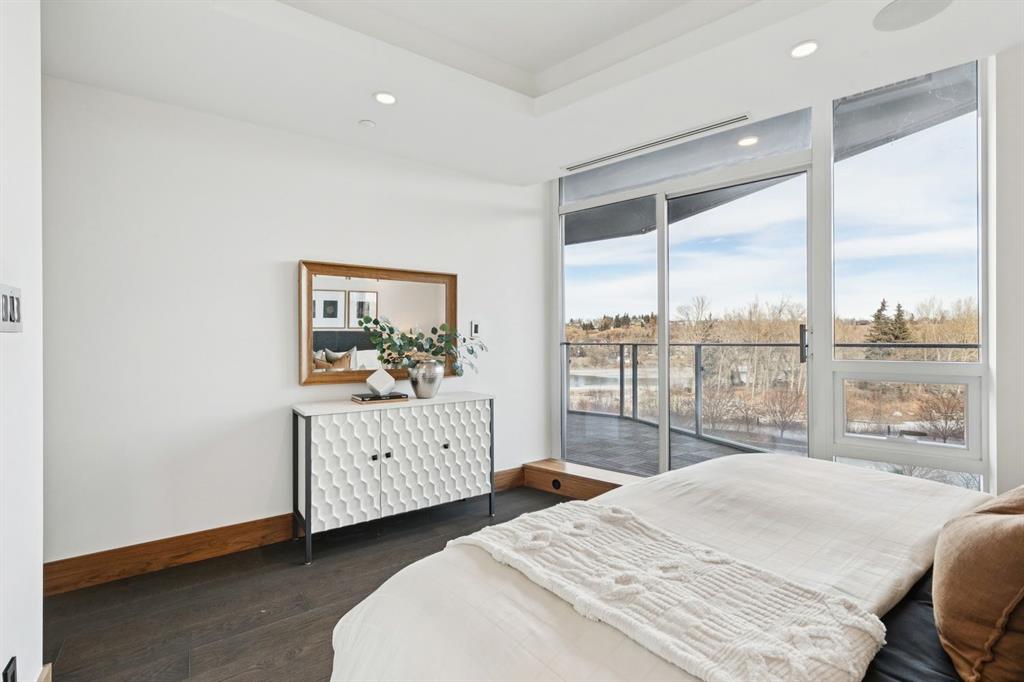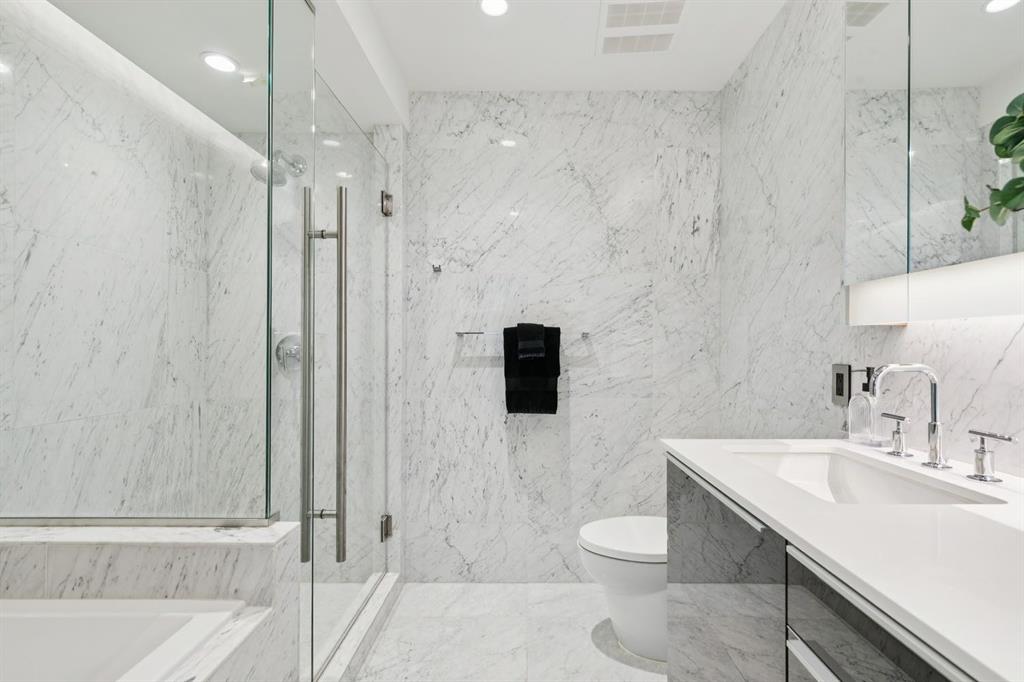 Journey down the hall to find the large primary bedroom, offering direct access to one of the balconies through generous patio glass doors. The opulent 5-piece ensuite features his/her sinks, a tall glass and marble shower, heated floors, & a luxurious jacuzzi soaker tub. The spacious walk-in closet ensures effortless organization.