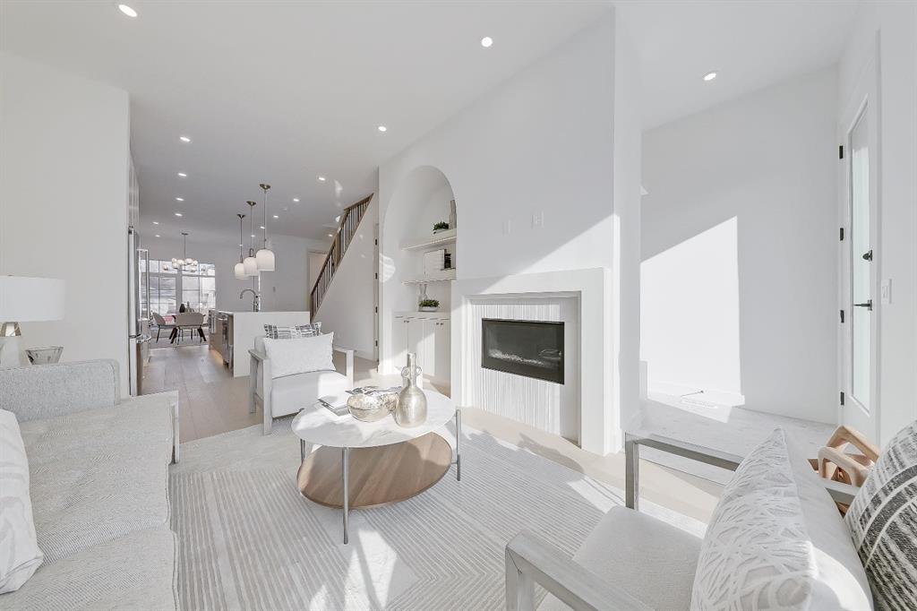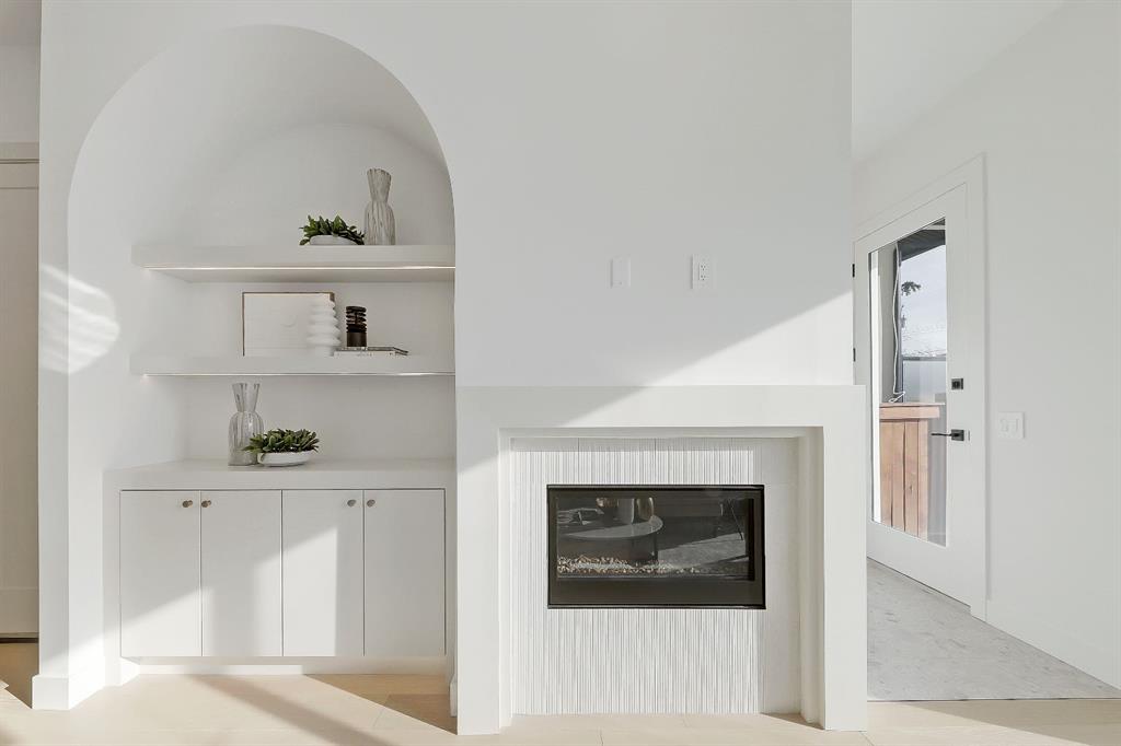The upgraded stainless steel appliance package includes a gas range, French door refrigerator, built-in microwave, and dishwasher — ideal for everyday living and hosting alike. At the rear of the home, the spacious living room centers around a sleek gas fireplace with designer textured tile surround, flanked by custom built-in cabinetry and illuminated shelving.