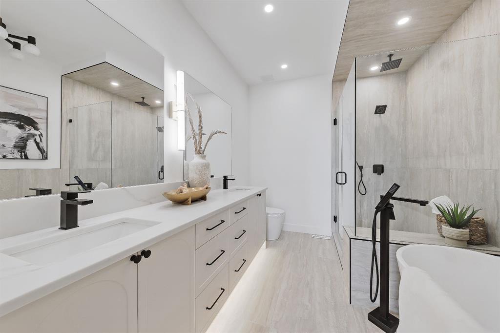 Upstairs, the primary suite is a true retreat. A soaring vaulted ceiling enhances the sense of space, complemented by a generous walk-in closet with built-in organization. The spa-inspired ensuite features a double vanity, freestanding soaking tub, and a glass-enclosed shower with bench & dual shower heads. Professionally curated designer tile and light-toned quartz create a timeless, calming atmosphere.