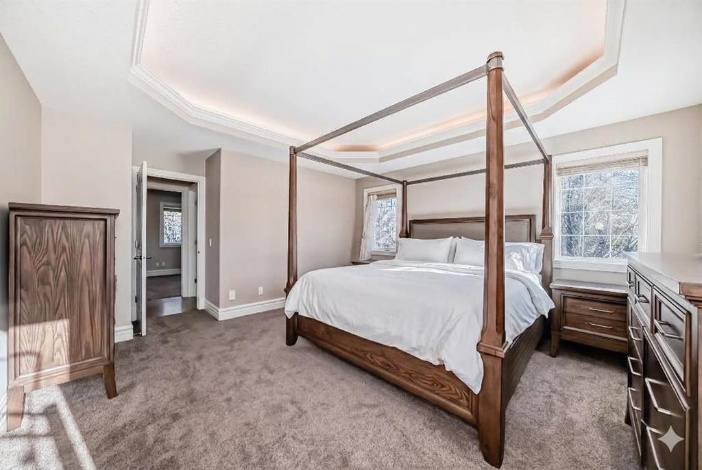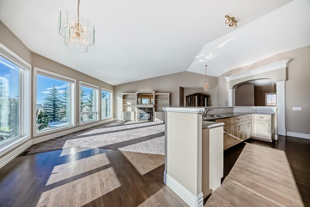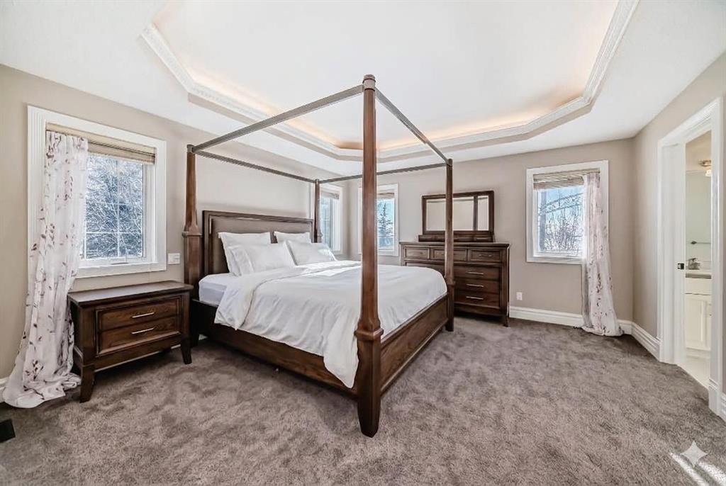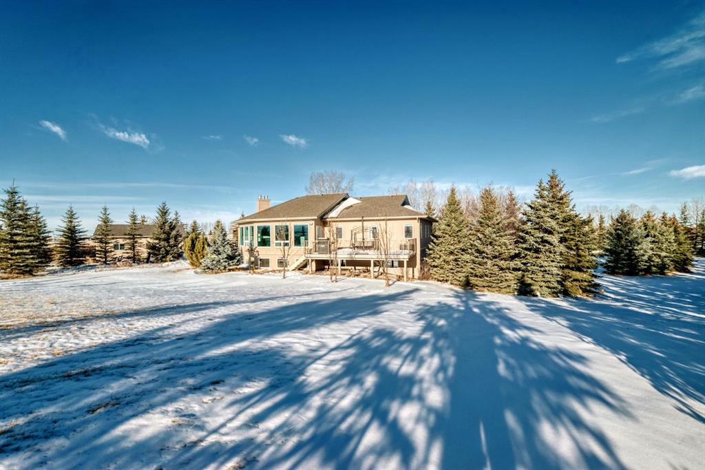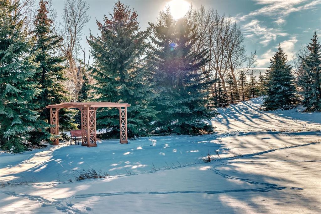 Car or hobby enthusiasts will appreciate the attached triple oversized garage with 14-foot ceilings to accommodate a lift, including one 11-foot high door. This heated & drywalled space also features upper storage, a closet, man door access, & rough-in plumbing for a sink. In addition, a newer 2nd detached triple garage is powered, heated, & drywalled. Surrounded by mature trees, this private property feels like your own personal park. A picturesque gazebo sits beside the pond, which transforms into a skating rink in winter, complete with power & water access. On the back side of the home, enjoy cozy evenings gathered around the fire pit area. The yard offers both mountain & glimpses of downtown Calgary in the distance—an incredible backdrop for everyday living.